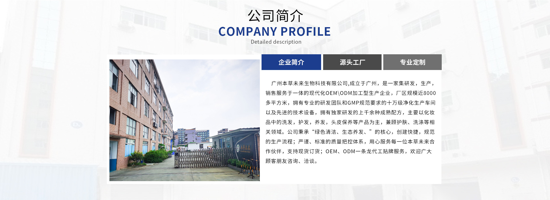 廣州本草未來生物科技有限公司: 公司坐落于廣州市花都區(qū),是一家集研發(fā),生產(chǎn),銷售服務(wù)于一體的現(xiàn)代化OEM\ODM加工型生產(chǎn)企業(yè),廠區(qū)規(guī)模近8000多平方米,擁有專業(yè)的研發(fā)團隊和GMP規(guī)范要求的十萬級凈化生產(chǎn)車間以及先進的技術(shù)設(shè)備,擁有獨家研發(fā)的上千余種成熟配方,主要以化妝品中的洗發(fā),護發(fā),養(yǎng)發(fā),頭皮保養(yǎng)、面部清潔、身體清潔等產(chǎn)品為主,兼顧護膚、洗滌等相關(guān)領(lǐng)域。公司秉承“綠色清潔、生態(tài)養(yǎng)發(fā)、草本護膚”為核心,始終堅持以“本草精髓,生物創(chuàng)新,天然健康”為研發(fā)使命,以“質(zhì)量至上,客戶至上”為企業(yè)的核心價值觀,“以人為本,誠信,務(wù)實”的服務(wù)理念,用良心好做產(chǎn)品,創(chuàng)建快捷,規(guī)范的生產(chǎn)流程;嚴謹、標準的質(zhì)量把控體系,用心服務(wù)每一位本草未來合作伙伴。