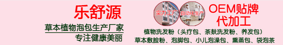 樂舒源擁有10年草本植物研發(fā)、生產(chǎn)經(jīng)驗,專注于草本植物養(yǎng)生調(diào)理亞健康。車間具有優(yōu)越的生產(chǎn)加工環(huán)境,具有現(xiàn)代化的包裝設(shè)備,獨立的產(chǎn)品研發(fā)實驗室,雄厚的研發(fā)服務(wù)團隊和貼心的售后服務(wù)。 專業(yè)生產(chǎn):泡腳包、泡腳粉、泡澡包、泡澡粉(男女泡澡包、小兒泡澡包)、泡浴包、泡浴粉、熏蒸包(頭部熏蒸包、身體熏蒸包、臉部熏蒸包、私處熏蒸包等)、敷粉(敷臉粉、敷身體粉)、敷包、洗發(fā)粉、洗發(fā)包、草本茶等草本植物泡包(粉).