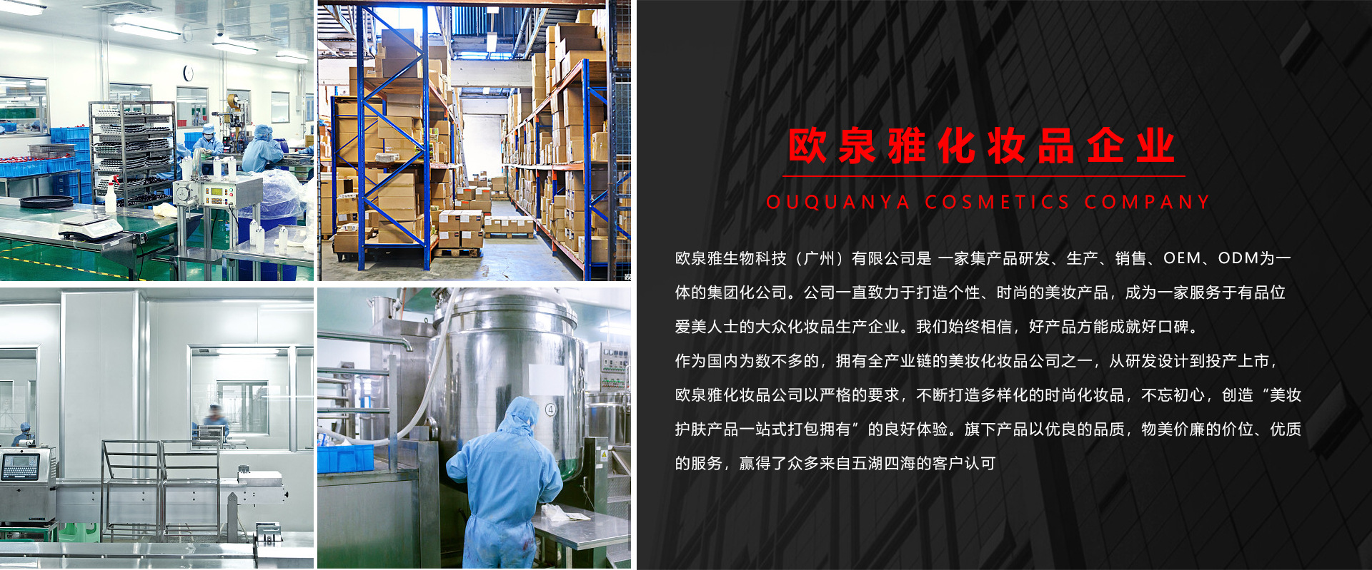 歐泉雅生物科技(廣州)有限公司是 一家集產(chǎn)品研發(fā)、生產(chǎn)、銷售、OEM、ODM為一 體的集團化公司。公司一直致力于打造個性、時尚的美妝產(chǎn)品,成為一家服務于有品位 愛美人士的大眾化妝品生產(chǎn)企業(yè)。我們始終相信,好產(chǎn)品方能成就好口碑。 作為國內(nèi)為數(shù)不多的,擁有全產(chǎn)業(yè)鏈的美妝化妝品公司之一,從研發(fā)設計到投產(chǎn)上市, 歐泉雅化妝品公司以嚴格的要求,不斷打造多樣化的時尚化妝品,不忘初心,創(chuàng)造“美妝 護膚產(chǎn)品一站式打包擁有”的良好體驗。旗下產(chǎn)品以優(yōu)良的品質(zhì),物美價廉的價位、優(yōu)質(zhì) 的服務,贏得了眾多來自五湖四海的客戶認可