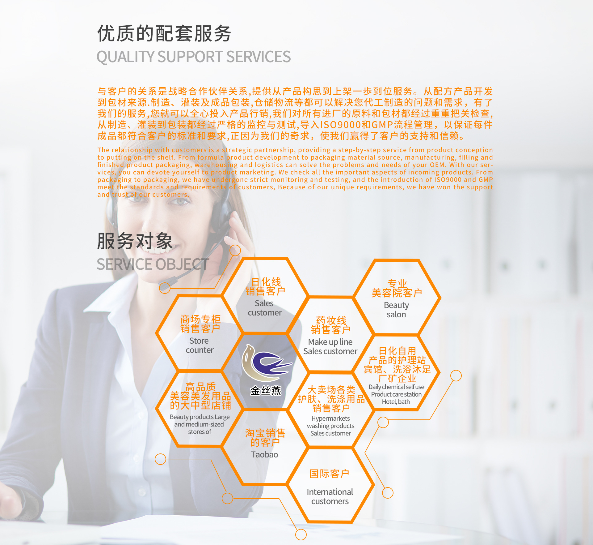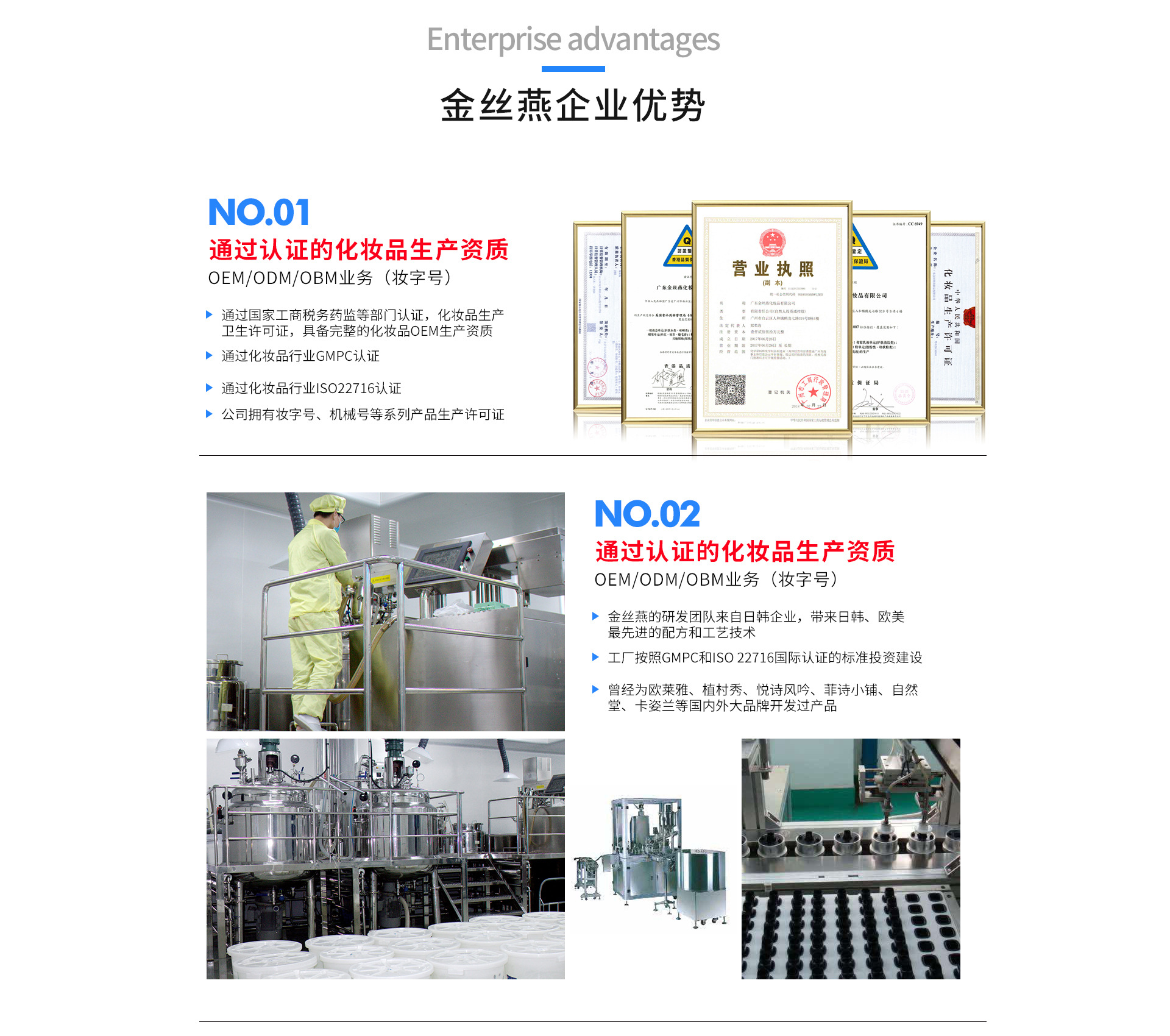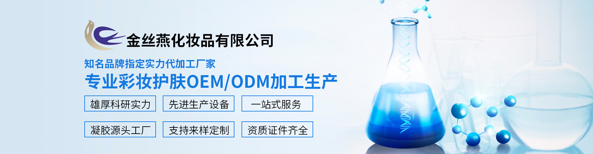廣東金絲燕化妝有限公司,自2017年成立以來,發(fā)展成為一家成長(zhǎng)迅速的現(xiàn)代化、高標(biāo)準(zhǔn)的化妝品代加工生產(chǎn)基地,集科研、市場(chǎng)、設(shè)計(jì)、質(zhì)檢、銷售、生產(chǎn)和物流于一體。是天貓、淘寶、微商、美容院線、線下實(shí)體店等客戶打造爆品的優(yōu)質(zhì)OEM/ODM/OBM企業(yè)。 金絲燕的研發(fā)團(tuán)隊(duì)來自日韓企業(yè),帶來日韓、歐美最先進(jìn)的配方和工藝技術(shù),曾經(jīng)為國(guó)內(nèi)外知名大品牌開發(fā)過熱賣產(chǎn)品,我們?cè)O(shè)計(jì)團(tuán)隊(duì)和銷售團(tuán)隊(duì)曾經(jīng)服務(wù)過國(guó)內(nèi)頂級(jí)大型美妝連鎖店。工廠共有16條生產(chǎn)線,其中10條生產(chǎn)線為10萬級(jí)的專業(yè)凈化車間,我司是美國(guó)FDA的化妝品GMPC認(rèn)證企業(yè)、歐盟ISO 22716國(guó)際認(rèn)證企業(yè)。我們以穩(wěn)定優(yōu)異的品質(zhì),豐富多樣的種類為客戶提供最全面優(yōu)質(zhì)的產(chǎn)品和服務(wù)。同時(shí)洞悉和引領(lǐng)美妝市場(chǎng)趨勢(shì)與潮流,基于我們多年的開發(fā)經(jīng)驗(yàn),將流行趨勢(shì)與先進(jìn)技術(shù)結(jié)合,不斷創(chuàng)新,最終轉(zhuǎn)化為具有吸引力和競(jìng)爭(zhēng)力的爆品。