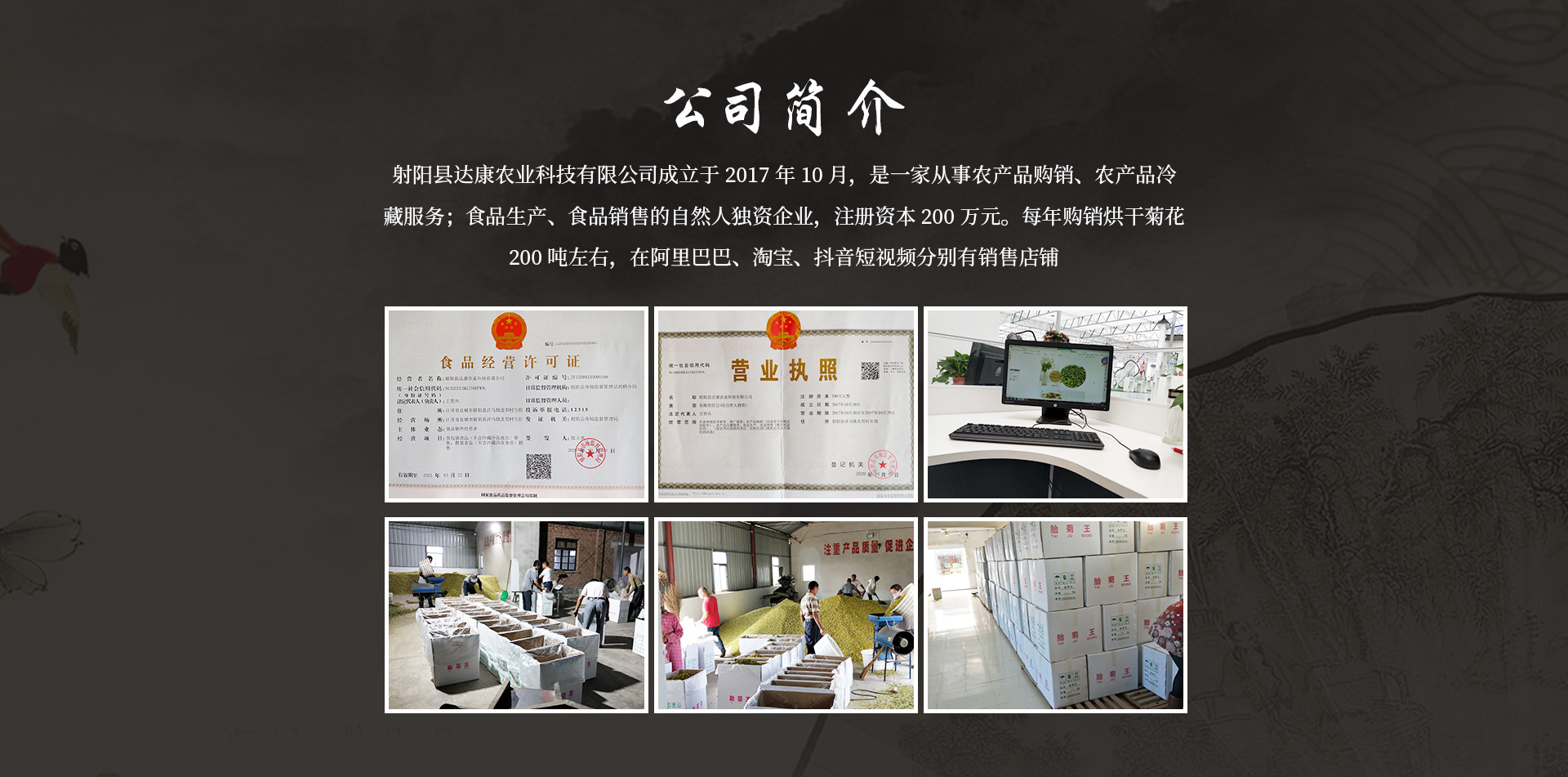 我公司主要經(jīng)營(yíng)農(nóng)產(chǎn)品購(gòu)銷,農(nóng)產(chǎn)品冷藏服務(wù),代用茶生產(chǎn),食品經(jīng)營(yíng)等項(xiàng)目。年烘干菊花200噸以上,銷售300噸,網(wǎng)上批發(fā)銷售代用茶10萬(wàn)件以上,歡迎與天下朋友合作共贏,共創(chuàng)美好未來(lái)!
