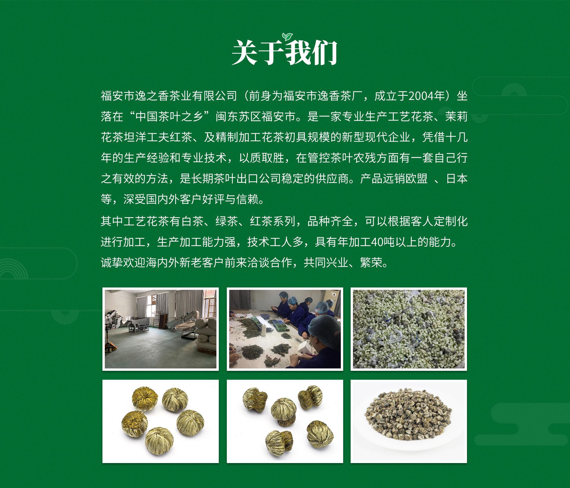 福安市逸之香茶業(yè)有限公司(前身為福安市逸香茶廠,成立于2004年)坐落在“中國茶葉之鄉(xiāng)”閩東蘇區(qū)福安市.是一家專業(yè)生產(chǎn)工藝花茶 ,茉莉花茶 坦洋工夫紅茶 及精制加工花茶初具規(guī)模的新型現(xiàn)代企業(yè),憑借十幾年的生產(chǎn)經(jīng)驗和專業(yè)技術,以質取勝,在管控茶葉農(nóng)殘方面有自己一套行之有效的方法,長期是茶葉出口公司穩(wěn)定的供應商。產(chǎn)品遠銷歐盟 等國。深受國內外客戶好評與信賴。 其中工藝花茶有白茶 綠茶 紅茶系列,品種齊全,可以根據(jù)客人定制化進行加工。生產(chǎn)加工能力強。技術工人多。具有年加工40噸以上的能力。