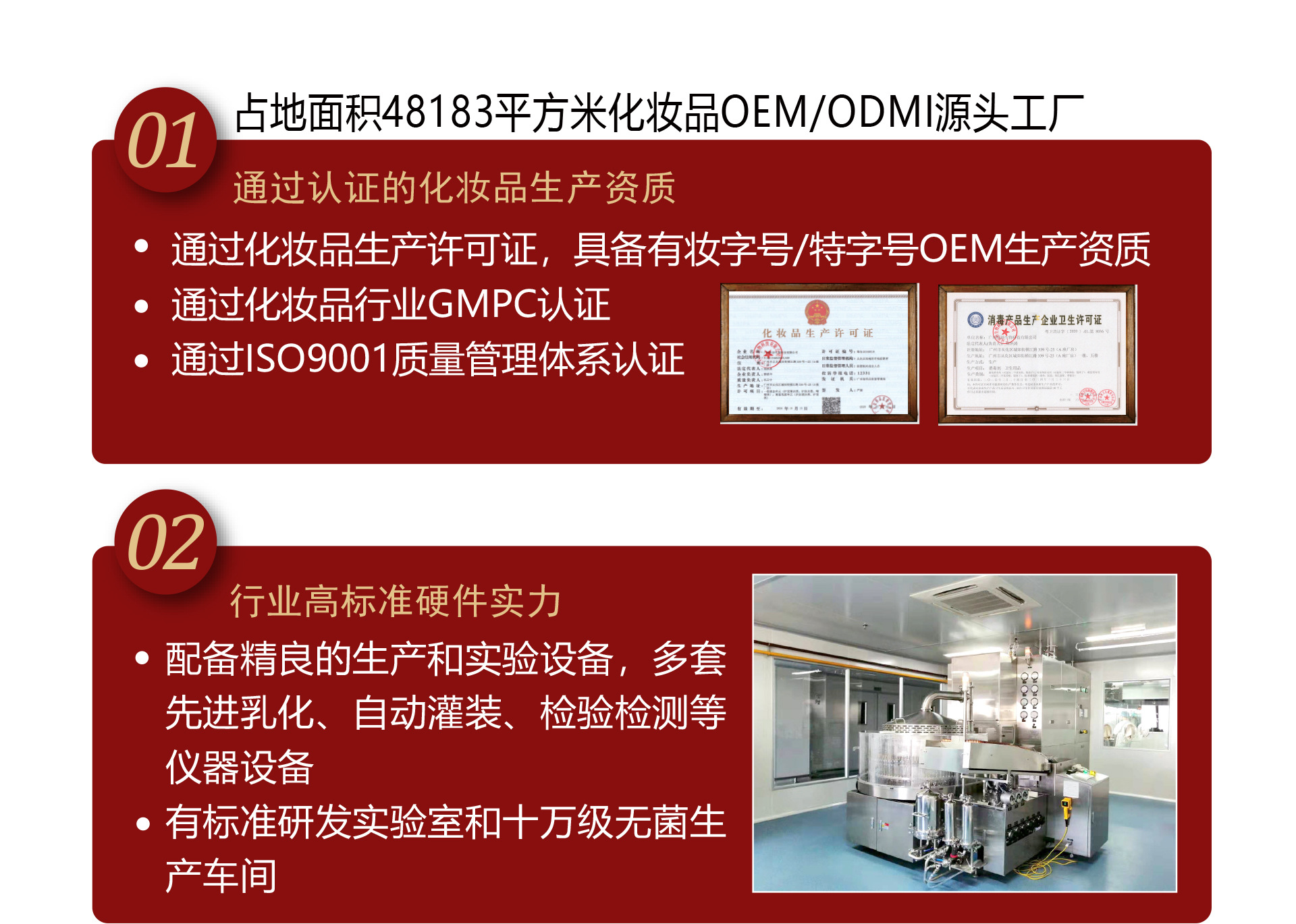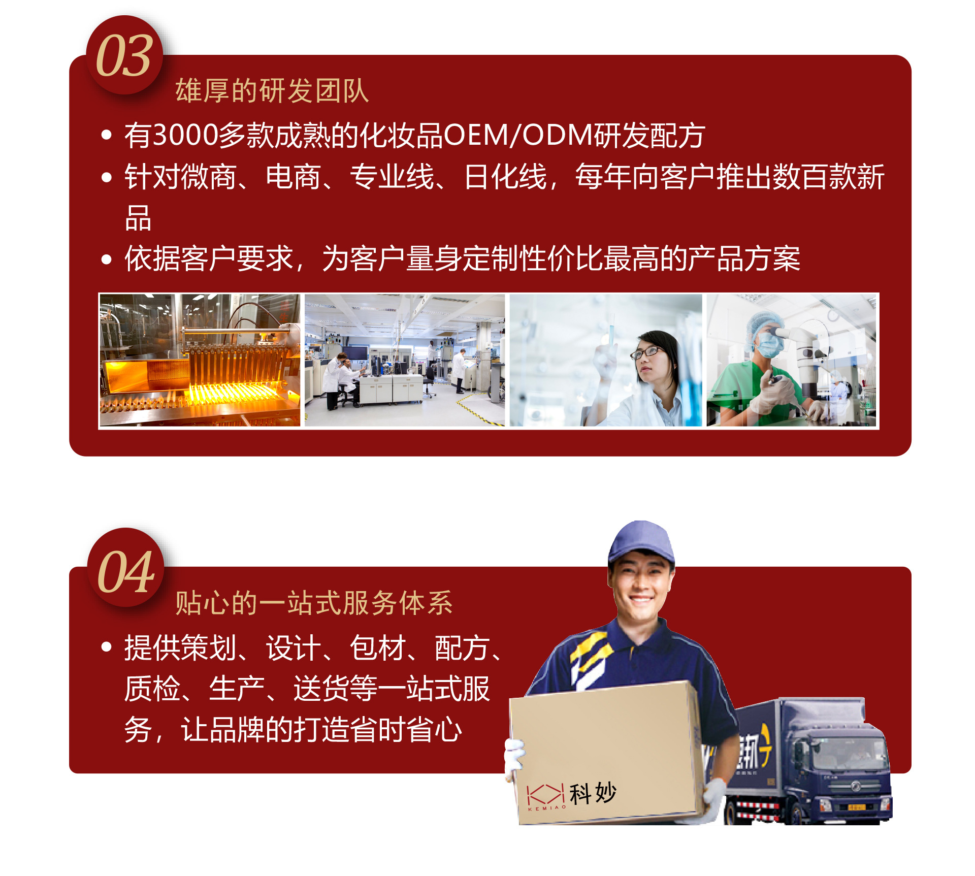 廣州科妙生物科技有限公司 (簡稱科妙生物) 是一家專業(yè)化妝品OEM/ODM 生產基地,座落在美麗的流溪河旁,依山畔水,環(huán)境優(yōu)美。28 分鐘就可快速到達 廣州白云國際機場,交通便利。 本公司產品具有前瞻性、合理性、植物性、相溶性、專業(yè)性、穩(wěn)定性、安全 性、特效性。明星產品突出,致力于全方位服務電商、微商、線下品牌,美容專業(yè) 線等客戶群體。 科妙生物擁有實際使用面積 48183多平方米的現代化工業(yè)廠房,自動化流水 生產線 16 條,保障了每天不低于 30萬支合格產品的產量!工廠嚴格按照十萬級 GMPC 生產標準建設, 并通過 ISO國際體系認證、 標準進行設計建造 7S 管理原則、 高標準的生化研究室和檢驗室,綠色環(huán)保 600Kwp 光伏項目的使用,確保技術優(yōu)勢 所需硬件要求,領先同行業(yè)競爭對手。本公司的原料采購遍及世界各大主流產區(qū),