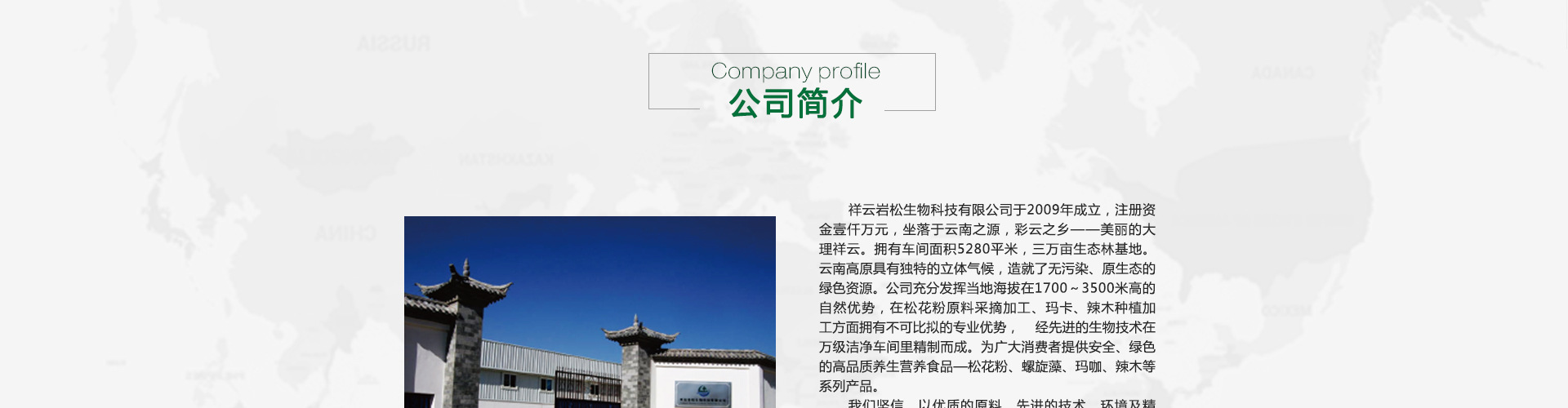 祥云巖松生物科技有限公司于2009年成立,注冊資金壹仟萬元,坐落于云南之源,彩云之鄉(xiāng)——美麗的大理祥云。擁有車間面積2326平米,三萬畝生態(tài)林基地。云南高原具有獨特的立體氣候,造就了無污染、原生態(tài)的綠色資源。公司充分發(fā)揮當(dāng)?shù)睾0卧?700~3500米高的自然優(yōu)勢,在松花粉原料采摘加工、瑪卡、辣木種植加工方面擁有不可比擬的專業(yè)優(yōu)勢, 經(jīng)先進的生物技術(shù)在萬級潔凈車間里精制而成。為廣大消費者提供安全、綠色的高品質(zhì)養(yǎng)生營養(yǎng)食品—松花粉、螺旋藻、瑪咖、辣木等系列產(chǎn)品。 我們堅信,以優(yōu)質(zhì)的原料、先進的技術(shù),環(huán)境及精密的檢測體系、誠信的經(jīng)營理念打造的巖松牌系列產(chǎn)品,終將成為每一位客戶信賴的產(chǎn)品。 公司全心致力于云南天然生物資源健康食品的開發(fā)。恪守職業(yè)道德、創(chuàng)造品牌特色,全心全意地致力于全民的健康事業(yè),以專業(yè)化的技術(shù)、優(yōu)異的產(chǎn)品、卓越的服務(wù)為全民健康事業(yè)和國民素質(zhì)的整體提高而不懈努力。
