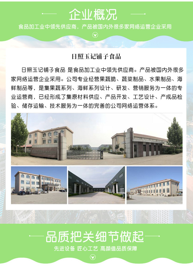 日照玉記鋪?zhàn)邮称酚邢薰緦I(yè)從事VF(真空低溫脫水)食品加工產(chǎn)業(yè),自有100多畝大型工業(yè)園區(qū),擁有先進(jìn)的VF設(shè)備生產(chǎn)線,在原有果蔬脆系列產(chǎn)品基礎(chǔ)上,研發(fā)出系列化的菌菇脆、海鮮脆等眾多新品種,積極倡導(dǎo)加工健康食品。 果蔬脆系列:精選新鮮蔬菜和水果,利用精湛的VF(真空低溫脫水)技術(shù),鎖住蔬菜、水果本味及營(yíng)養(yǎng),留住一日天然所需,VF技術(shù)可保持原蔬果95%以上的營(yíng)養(yǎng)成分,營(yíng)養(yǎng)流失甚少,不論視覺還是口感和味道上,都非常優(yōu)秀。果蔬脆片產(chǎn)品嚴(yán)格區(qū)別于薯片等油炸膨化食品,生產(chǎn)工藝流程無(wú)膨化過(guò)程,不添加人工色素,做出的果蔬脆帶著天然清新的果蔬原味,夾著酥脆的口感,是天然、營(yíng)養(yǎng)、健康的即食果蔬。 海鮮脆系列:公司全新一代VF海鮮脆產(chǎn)品,原料挑選自深海鮮活海產(chǎn)品,VF海鮮脆產(chǎn)品嚴(yán)格區(qū)別于傳統(tǒng)的海鮮干制品,生產(chǎn)過(guò)程不需要膨化、高溫油炸、無(wú)高溫烘烤等,不添加人工色素、含鹽量低,易咀嚼好消化