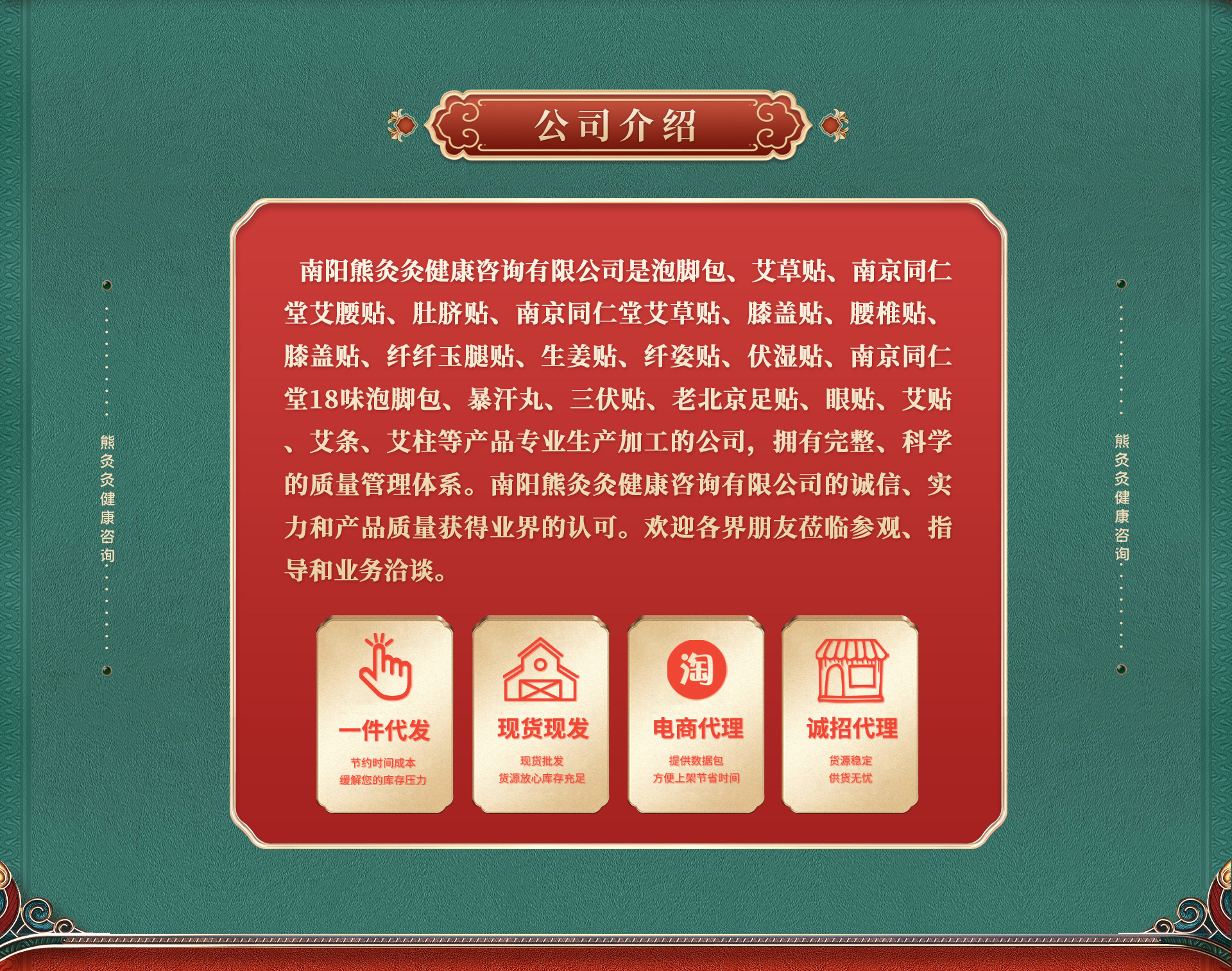 南陽熊灸灸健康咨詢有限公司是泡腳包、艾草貼、南京同仁堂艾腰貼、肚臍貼、南京同仁堂艾草貼、膝蓋貼、腰椎貼、膝蓋貼、纖纖玉腿貼、生姜貼、纖姿貼、伏濕貼、南京同仁堂18味泡腳包、暴汗丸、三伏貼、老北京足貼、眼貼、艾貼、艾條、艾柱等產(chǎn)品專業(yè)生產(chǎn)加工的公司,擁有完整、科學(xué)的質(zhì)量管理體系。南陽熊灸灸健康咨詢有限公司的誠信、實(shí)力和產(chǎn)品質(zhì)量獲得業(yè)界的認(rèn)可。歡迎各界朋友蒞臨參觀、指導(dǎo)和業(yè)務(wù)洽談。