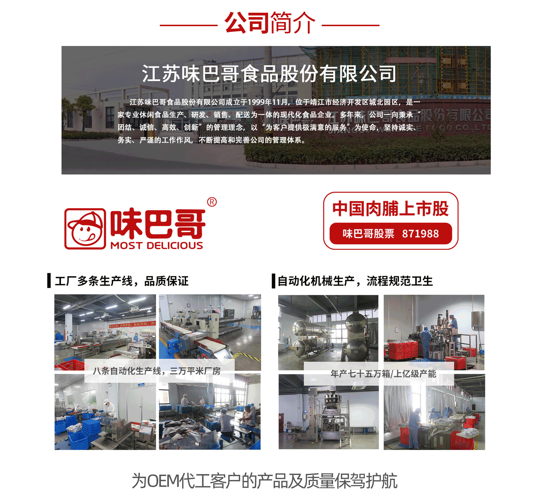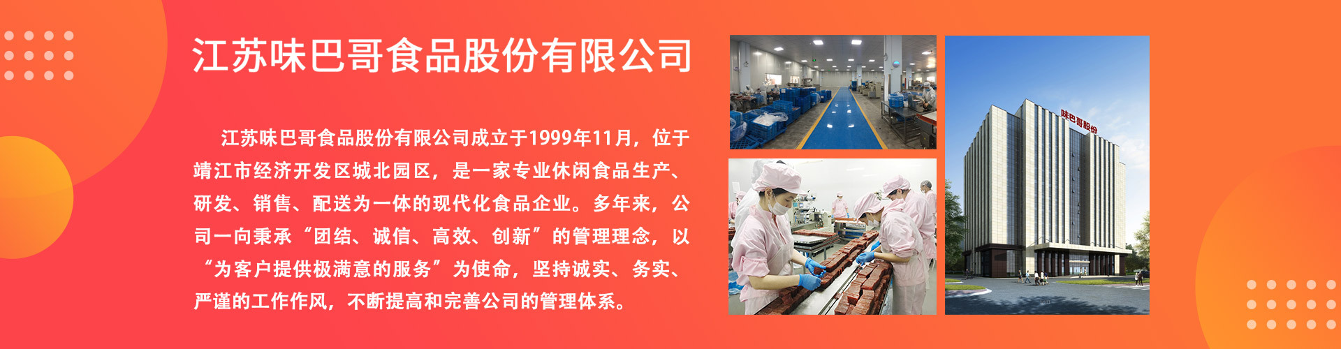 江蘇味巴哥食品股份有限公司,始創(chuàng)于2004年,是一家專業(yè)從事食品科研、生產(chǎn)、銷售于一體的股份制私營企業(yè),坐落于魚米之鄉(xiāng)江蘇靖江。公司擁有“味巴哥”“谷大叔”兩大品牌,致力于打造“綠色、健康、美味”的休閑食品。