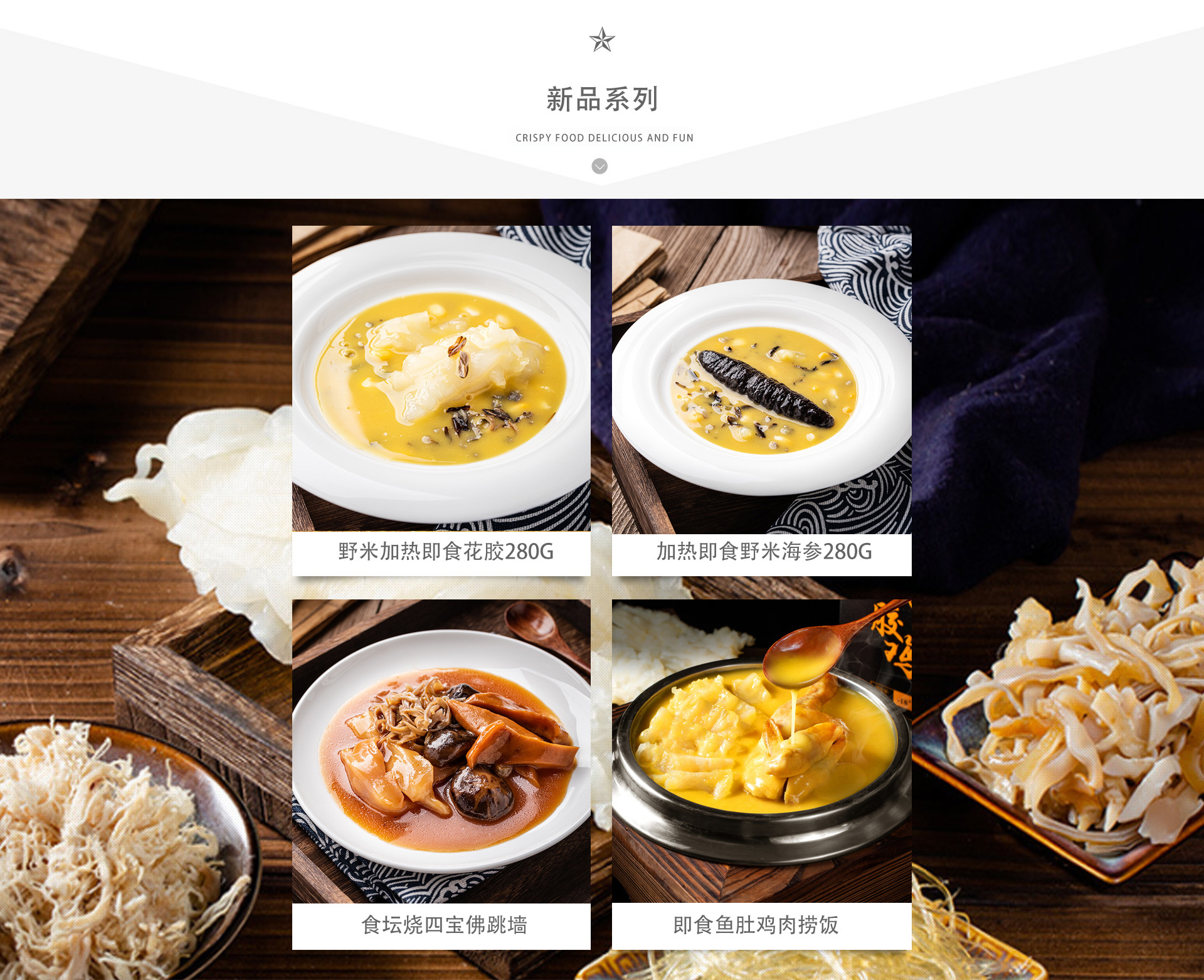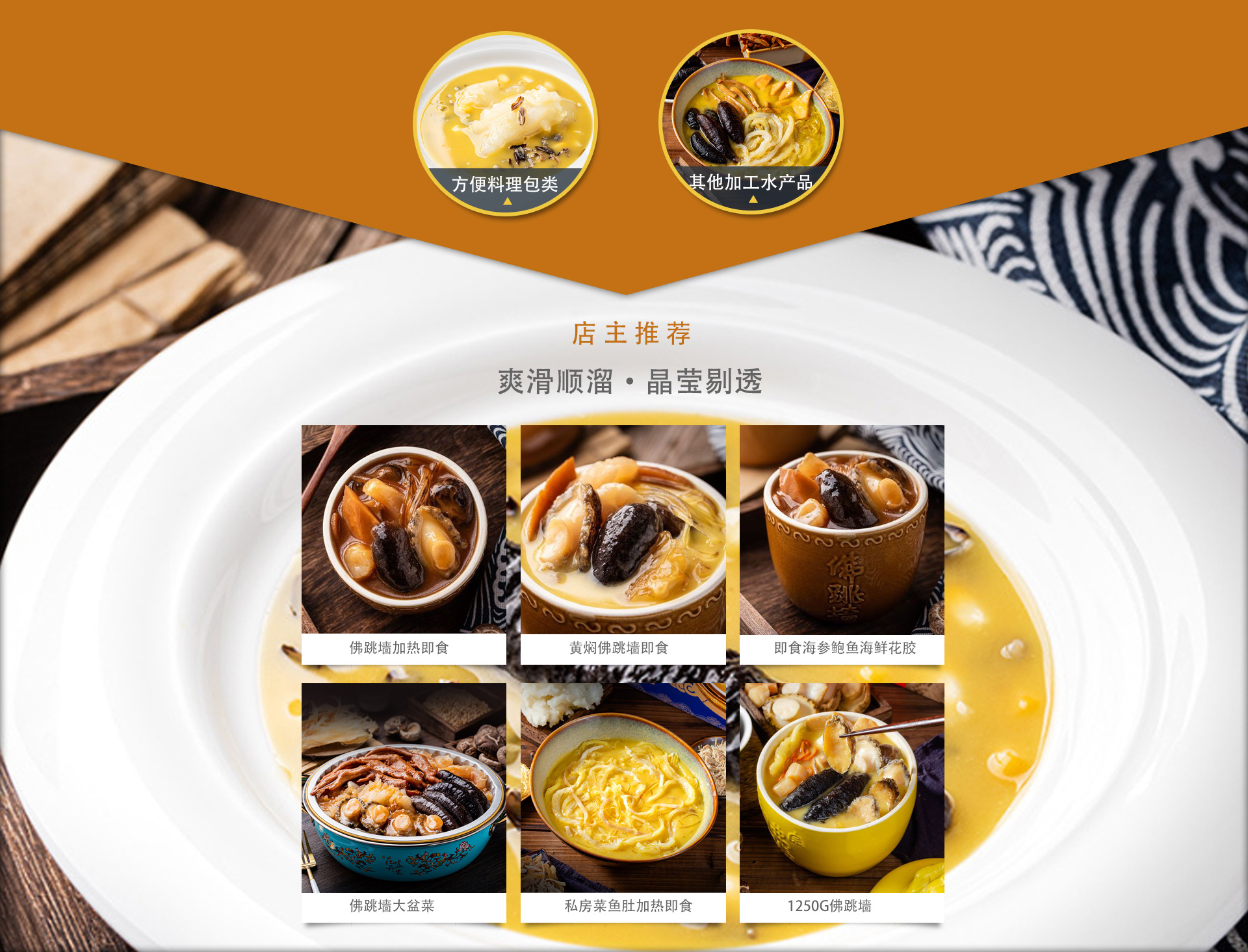 公司主營: 自產自銷福建正宗佛跳墻;大盆菜;花膠雞;鮑參翅肚;官府三絲等冷凍食品加熱即食產品。 公司擁有超10年的生產加工經驗,承接國內各大代理商,加盟商,酒店,酒席,宴會等承辦 生產經驗豐富,客戶之廣,客流之遠。