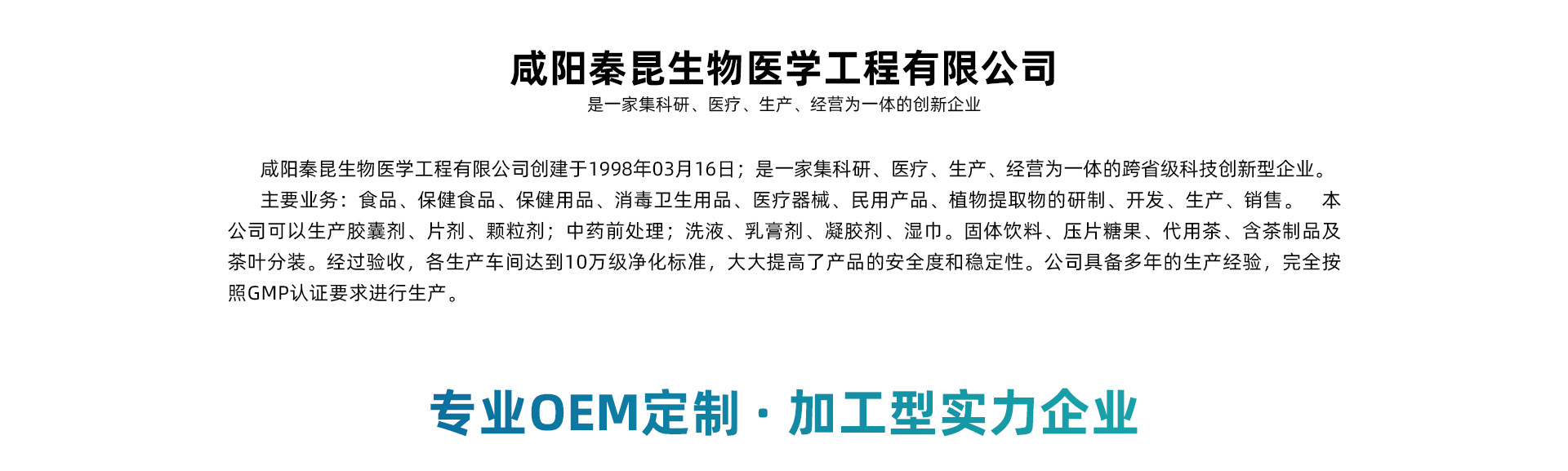 咸陽秦昆生物醫(yī)學(xué)工程有限公司創(chuàng)建于1998年03月16日;是一家集科研、生產(chǎn)、經(jīng)營為一體的跨省級(jí)科技創(chuàng)新型企業(yè)。 主要業(yè)務(wù):食品、保健用品、消毒衛(wèi)生用品、植物提取物的研制、開發(fā)、生產(chǎn)、銷售。本公司可以生產(chǎn)顆粒劑;中藥前處理;洗液、乳膏劑、凝膠劑、濕巾。固體飲料、壓片糖果、代用茶、含茶制品。經(jīng)過驗(yàn)收,生產(chǎn)車間達(dá)到10萬級(jí)凈化標(biāo)準(zhǔn)。公司具有雄厚的科研力量和技術(shù)設(shè)備。配置經(jīng)驗(yàn)豐富的研發(fā)團(tuán)隊(duì)、質(zhì)量控制中心、客服中心、物流中心等。2012年被咸陽市工商局授予光彩之星企業(yè)。
