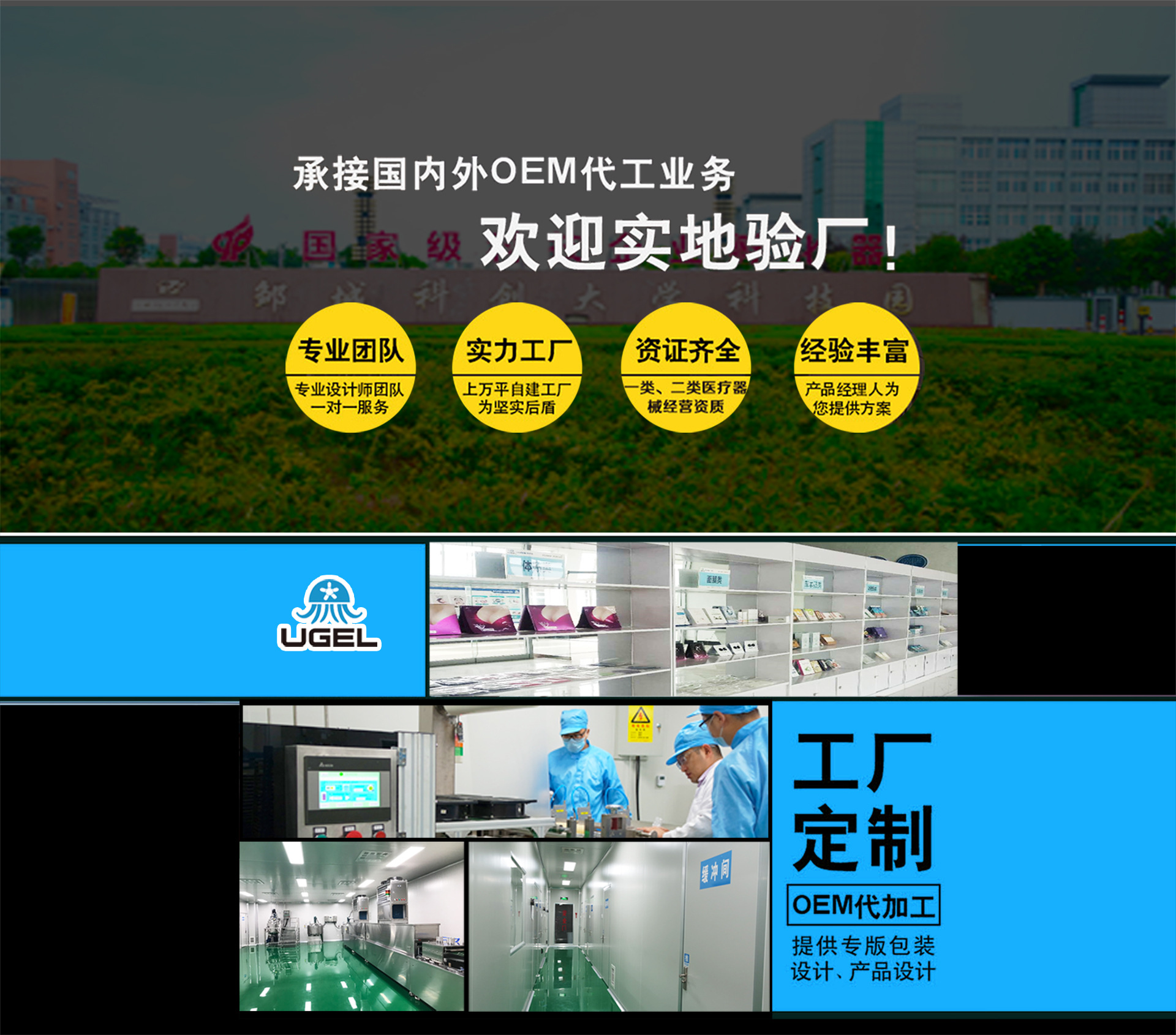 山東優(yōu)杰生物科技有限公司成立于2017年3月,專注于水凝膠創(chuàng)新產(chǎn)品的研發(fā)與生產(chǎn),目前已成為集研發(fā)、生產(chǎn)、銷售、進出口為一體的企業(yè),并致力于成為中國水凝膠產(chǎn)業(yè)的創(chuàng)新者與引領者。公司總面積10000㎡,擁有10萬級、30萬級潔凈廠房,具有醫(yī)療器械、化妝品、消毒產(chǎn)品、日用品等生產(chǎn)資質,專業(yè)生產(chǎn)水凝膠系列醫(yī)用貼劑、化妝品、醫(yī)美產(chǎn)品、日用品等,擁有12條自動生產(chǎn)線,日生產(chǎn)能力達40萬片(凝膠貼膜)+40萬瓶(凝膠)。 公司定位為“水凝膠創(chuàng)新產(chǎn)品專家”,由業(yè)內(nèi)知名專家?guī)ьI的研發(fā)團隊,擁有多項核心專利,并與山東中醫(yī)藥大學合作共建中藥凝膠貼劑產(chǎn)學研基地,與山東生命科技研究院共建創(chuàng)傷修復技術平臺,與瑞士LONZA合作凝膠身體貼膜聯(lián)合實驗室,與上海冠英生物共建水凝膠中試基地。