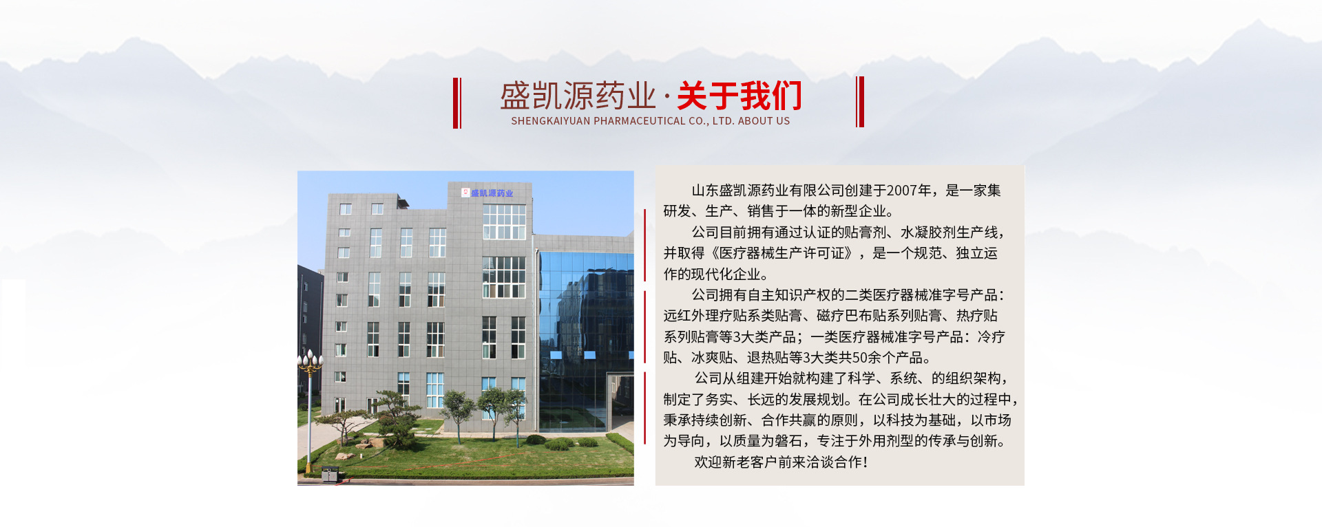 山東盛凱源藥業(yè)有限公司創(chuàng)建于2007年,是一家集研發(fā)、生產(chǎn)、銷售于一體的新型企業(yè),公司位于中國著名的泉城---濟(jì)南。 公司目前擁有通過認(rèn)證的貼膏劑、凝膠劑、噴霧劑、洗劑生產(chǎn)線4條,并取得《醫(yī)療器械生產(chǎn)許可證》、《衛(wèi)生許可證》,是一個(gè)完備、規(guī)范、獨(dú)立運(yùn)作的現(xiàn)代化企業(yè)。 公司擁有自主知識(shí)產(chǎn)權(quán)的遠(yuǎn)紅外理療貼、磁療巴布貼、熱療貼、高分子水凝膠貼劑、黑膏藥、凝膠劑、噴霧劑、洗劑等8大類50余個(gè)產(chǎn)品。