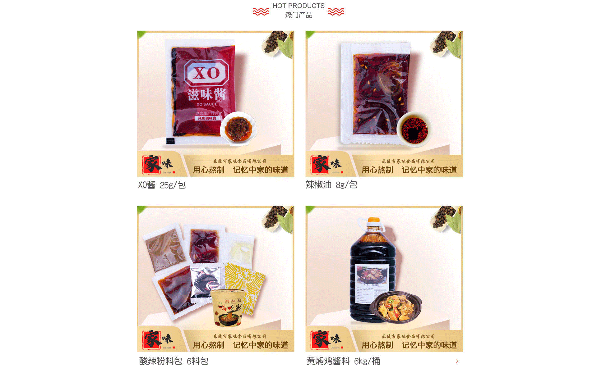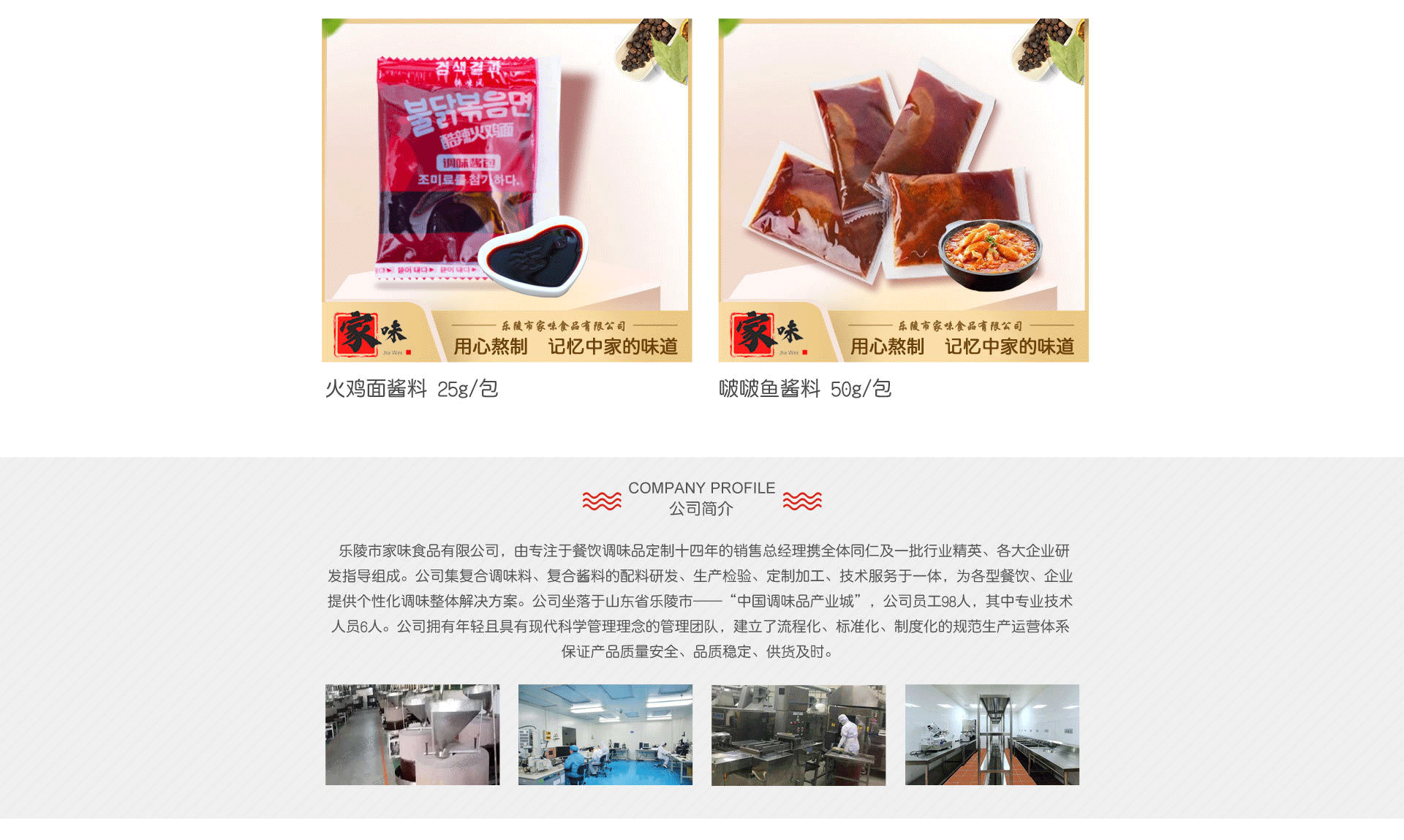 樂陵市家味食品有限公司,由專注于餐飲調(diào)味品定制十四年的銷售總經(jīng)理攜全體同仁及一批行業(yè)精英、各大企業(yè)研發(fā)指導(dǎo)組成。公司集復(fù)合調(diào)味料、復(fù)合醬料的配料研發(fā)、生產(chǎn)檢驗、定制加工、技術(shù)服務(wù)于一體,為各型餐飲、企業(yè)提供個性化調(diào)味整體解決方案。公司坐落于山東省樂陵市——“中國調(diào)味品產(chǎn)業(yè)城”,公司員工98人,其中專業(yè)技術(shù)人員6人。公司擁有年輕且具有現(xiàn)代科學(xué)管理理念的管理團隊,建立了流程化、標(biāo)準(zhǔn)化、制度化的規(guī)范生產(chǎn)運營體系,保證產(chǎn)品質(zhì)量安全、品質(zhì)穩(wěn)定、供貨及時。 公司通過專業(yè)研發(fā)人員與合作企業(yè)研發(fā)精英對接的實踐經(jīng)驗相結(jié)合,讓產(chǎn)品的研發(fā)與創(chuàng)新走在了行業(yè)的前列。尤其是在火鍋底、湯料、冒菜調(diào)料、烤魚料、啵啵魚料、新版煎餅果子醬料、土豆粉、米線、酸辣粉、外賣伴侶辣椒油包、醋包等多種餐飲定制領(lǐng)域推出了系列個性化產(chǎn)品。 公司不斷引進和改良先進的生產(chǎn)線,讓公司的生產(chǎn)能力不斷提升,確保各位合作伙伴所需產(chǎn)品的及時供應(yīng)。
