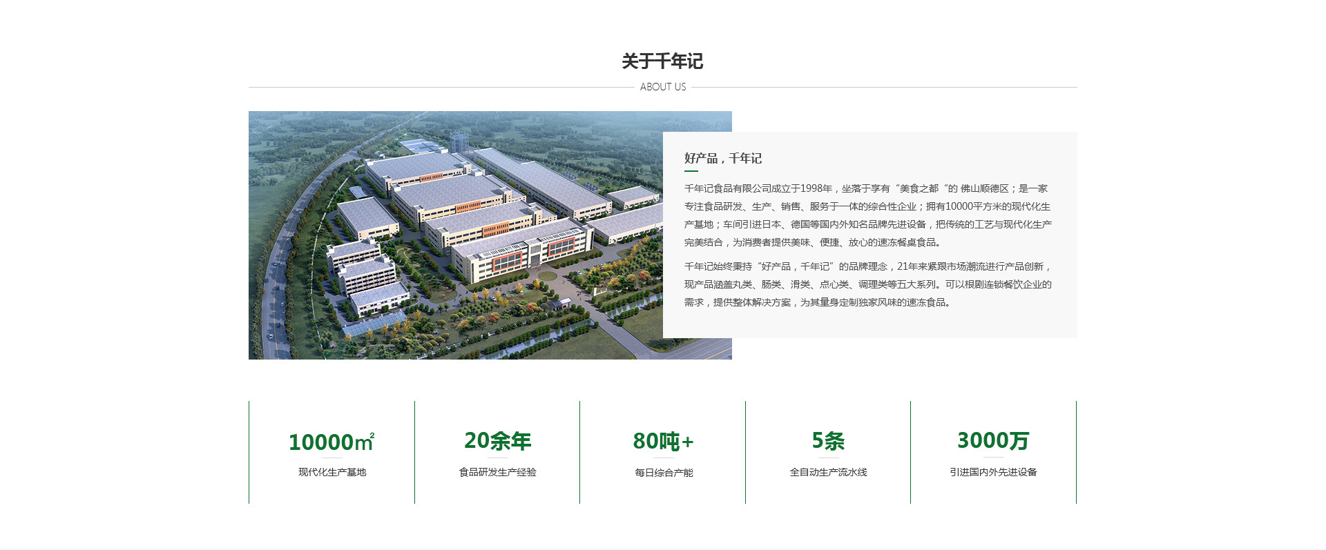 千年記食品成立于1998年,坐落于享有“美食之都“的 佛山順德區(qū);是一家專注食品研發(fā)、生產(chǎn)、銷售、服務(wù)于一體的綜合性企業(yè);擁有10000㎡現(xiàn)代化生產(chǎn)基地;車間引進(jìn)日本、德國(guó)等國(guó)內(nèi)外知名品牌先進(jìn)設(shè)備,把傳統(tǒng)的工藝與現(xiàn)代化生產(chǎn)完美結(jié)合,為消費(fèi)者提供美味、便捷、放心的速凍餐桌食品。 二十多年來(lái),千年記嚴(yán)格地選取原料、保持嚴(yán)謹(jǐn)高標(biāo)準(zhǔn)的管理,不斷堅(jiān)持客戶利益至上。在當(dāng)時(shí)傳統(tǒng)美食配方還未能適應(yīng)現(xiàn)代化的大批量工業(yè)生產(chǎn),千年記不斷地去搜尋解決方法,經(jīng)過(guò)多方探求,千年記運(yùn)用中華民族家族千年傳承秘制美食配方,配合規(guī)?;纳a(chǎn)流程,開(kāi)發(fā)出五大系列品種的速凍調(diào)制食品。 傳統(tǒng)的美食承載了地域文化、原始健康的食材制作手法及風(fēng)土人情。而“千年記”并不依賴傳統(tǒng)固步自封,在創(chuàng)始人的帶領(lǐng)下,“千年記”打破現(xiàn)代技術(shù)的約束,結(jié)合現(xiàn)代人的消費(fèi)習(xí)慣,還原食材特有的原生態(tài)美食文化和風(fēng)味,打造出真正高品質(zhì)的特色傳統(tǒng)美食。好食品,千年記!