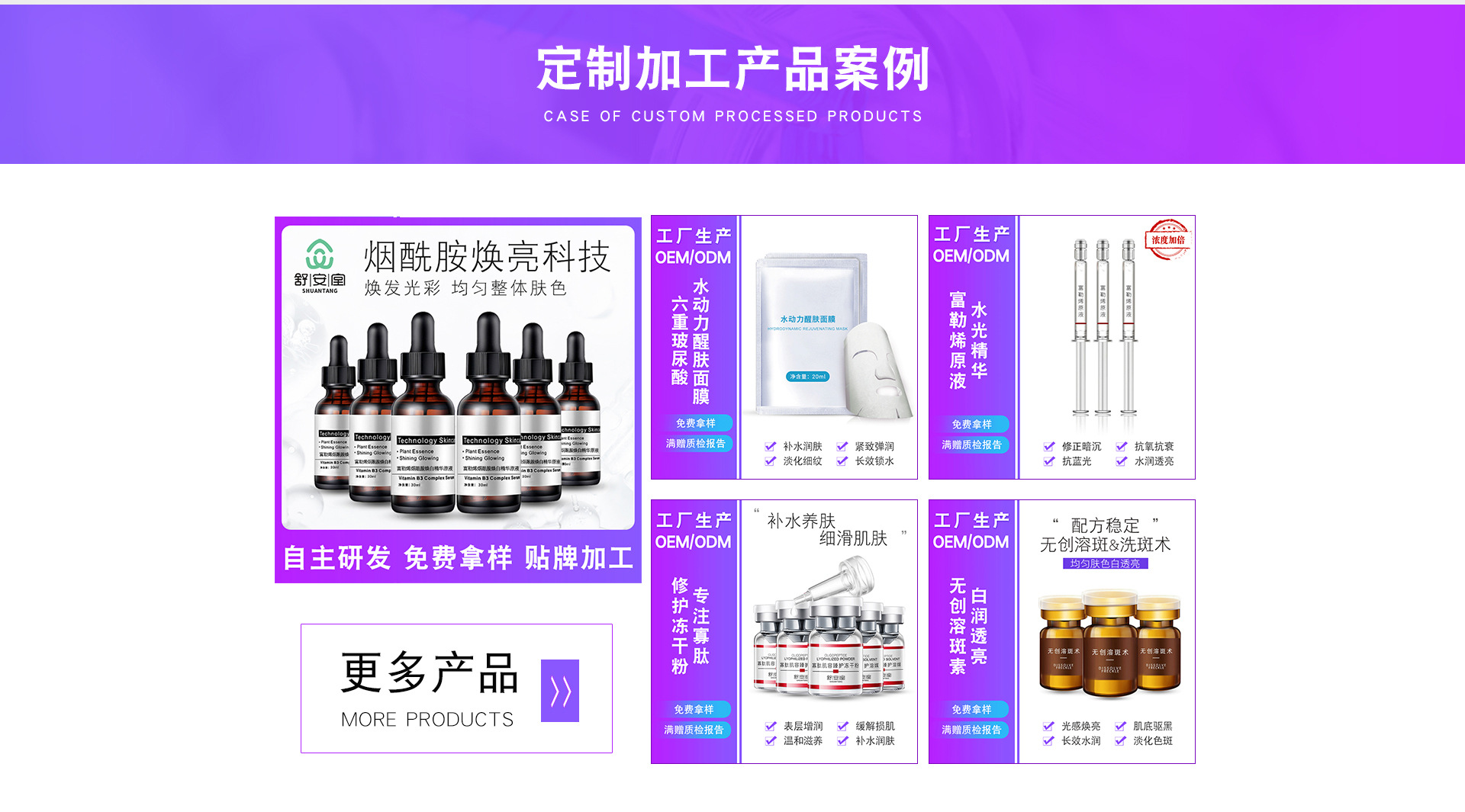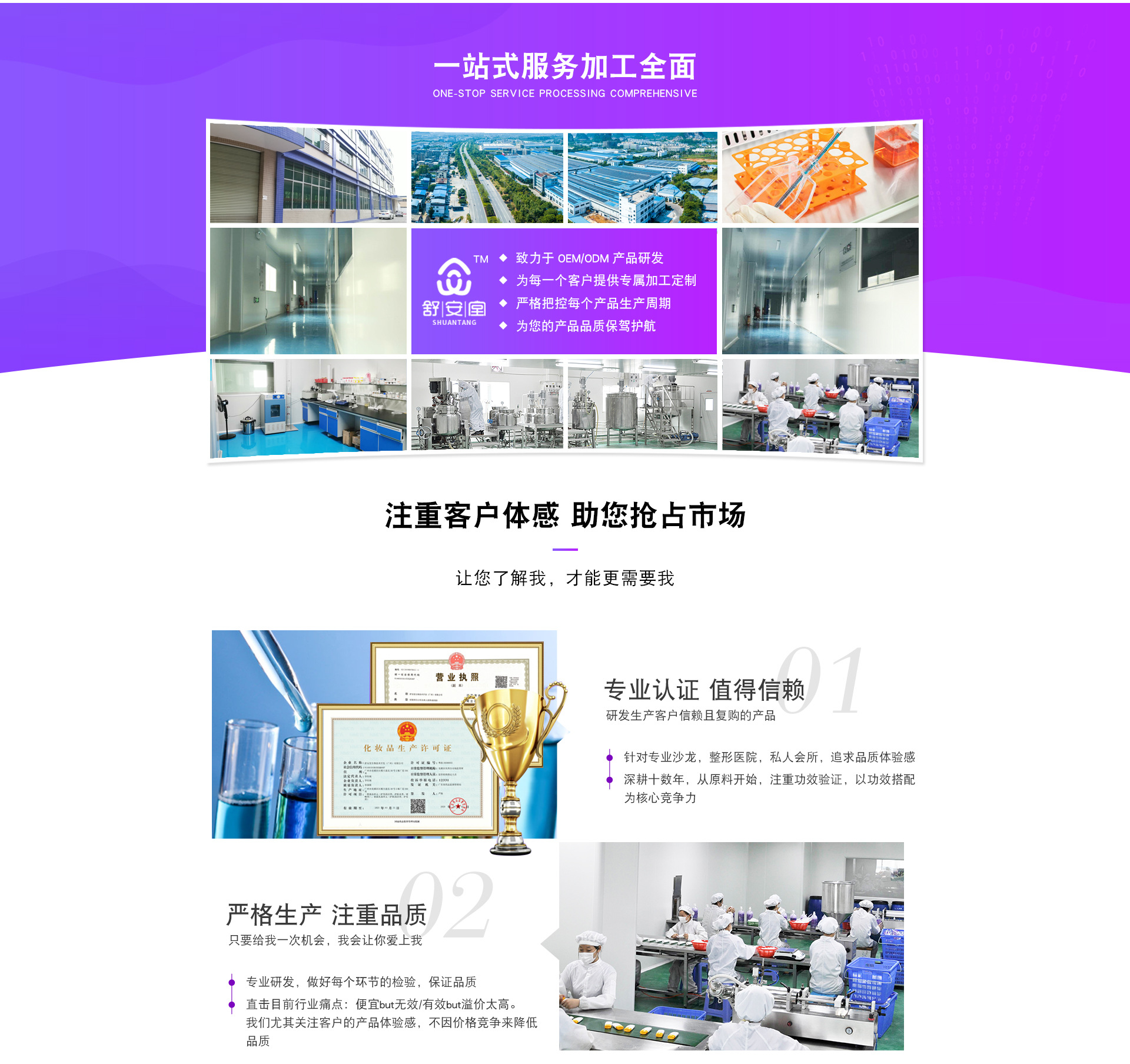 舒安堂生物科技開(kāi)發(fā)(廣州)有限公司是一家以化妝品生產(chǎn)技術(shù)的研發(fā)為核心、集策劃、生產(chǎn)、銷(xiāo)售為一體的實(shí)業(yè)公司。專(zhuān)注于中高端化妝品品牌及半成品OEM、OBM、ODM加工,為眾多品牌商、美容連鎖機(jī)構(gòu)、微商電商、開(kāi)發(fā)商提供高效、新穎、獨(dú)特、尖端的綠色環(huán)保系列產(chǎn)品。公司擁有5000多平方米,十萬(wàn)級(jí)無(wú)塵車(chē)間,超過(guò)8000多種成熟配方,數(shù)十人的科研團(tuán)隊(duì),日生產(chǎn)能力20噸。 公司的主要產(chǎn)品有洗面奶、化妝水、面膜、精華、原液、乳液、膏霜、精油、祛斑產(chǎn)品、減肥產(chǎn)品及隔離防曬、美白遮瑕、手霜、洗發(fā)水、沐浴露、養(yǎng)生產(chǎn)品,婦科產(chǎn)品等各系列護(hù)膚品加工服務(wù)。 舒安堂生物技術(shù)開(kāi)發(fā)(廣州)有限公司的誠(chéng)信、實(shí)力和產(chǎn)品質(zhì)量獲得業(yè)界的認(rèn)可。歡迎各界朋友蒞臨參觀、指導(dǎo)和業(yè)務(wù)洽談