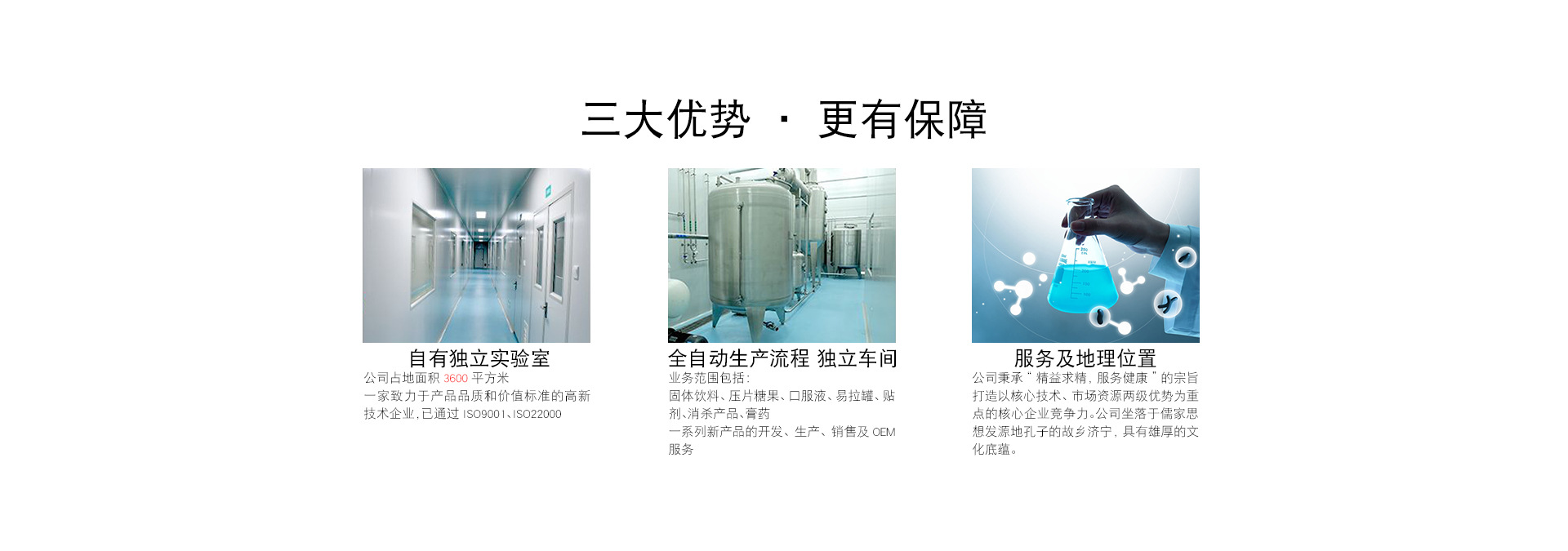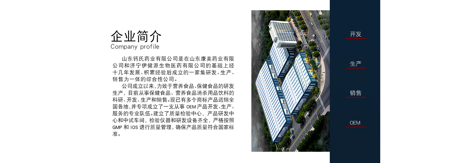 山東鈣氏藥業(yè)有限公司是在山東康美藥業(yè)有限公司和濟寧伊健源生物醫(yī)藥有限公司的基礎(chǔ)上經(jīng)十幾年的發(fā)展、積累經(jīng)驗后成立的一家集研發(fā)、生產(chǎn)、銷售為一體的綜合性公司。工廠坐落于山東省濟寧市唐口工業(yè)園區(qū)內(nèi),自然環(huán)境優(yōu)越是保健食品、營養(yǎng)食品生產(chǎn)基地,現(xiàn)有GMP標準廠房和SC認證車間,規(guī)范的實驗室。公司所在地交通便利,距濟徐高速公路5公里,濟寧機場6公里,火車站15公里鐵路運輸可達全國。廠區(qū)占地面積28000平方米,綜合辦公樓5800平方米,總投資3億元人民幣。 公司自成立以來,力致于營養(yǎng)食品、保健食品的研發(fā)生產(chǎn),利用已有的強大科研力量、健全的科研體系、現(xiàn)代化整合營銷管理方式以及龐大的市場營銷網(wǎng)絡(luò),形成了研發(fā)、生產(chǎn)、銷售為一體的現(xiàn)代化科技企業(yè)。公司目前主要從事保健食品、營養(yǎng)食品、消殺用品、飲料的科研、開發(fā)、生產(chǎn)和銷售?,F(xiàn)已有多個商標產(chǎn)品遠銷全國各地,并專項成立了一支從事OEM產(chǎn)品開發(fā)、生產(chǎn)、服務的專業(yè)隊