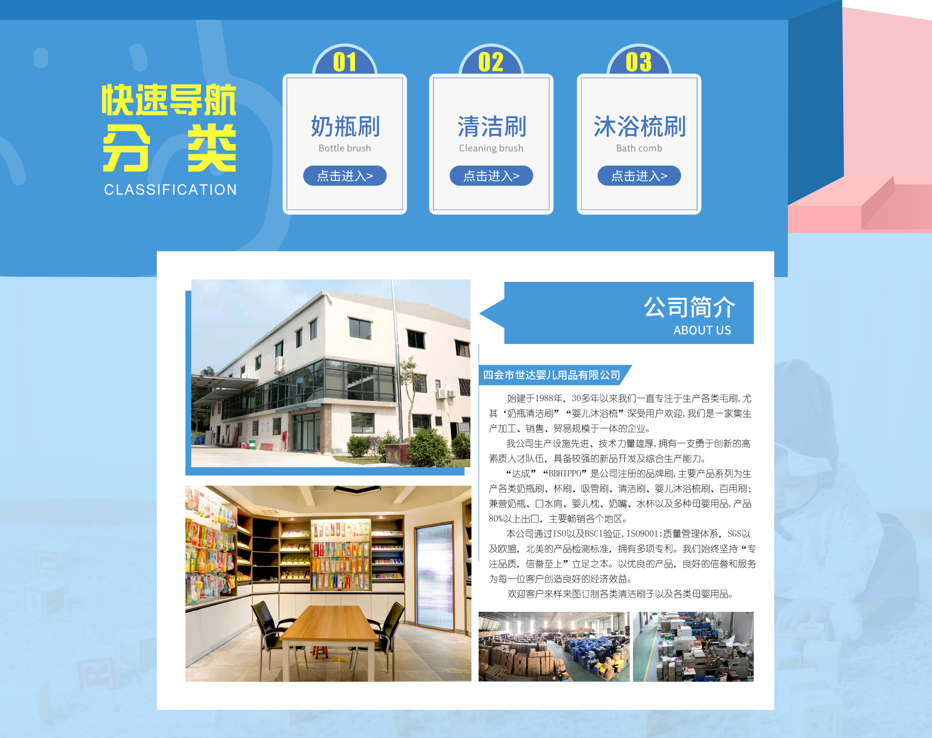 四會市世達(dá)制刷有限公司,始建于1988年,是-家30年專業(yè)生產(chǎn)各類毛刷、經(jīng)驗(yàn)豐富、集生產(chǎn)加工、銷售、貿(mào)易規(guī)模于一體的企業(yè),以主產(chǎn)奶瓶毛刷"深受用戶歡迎。