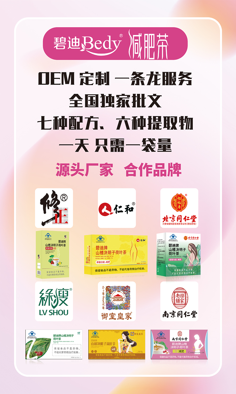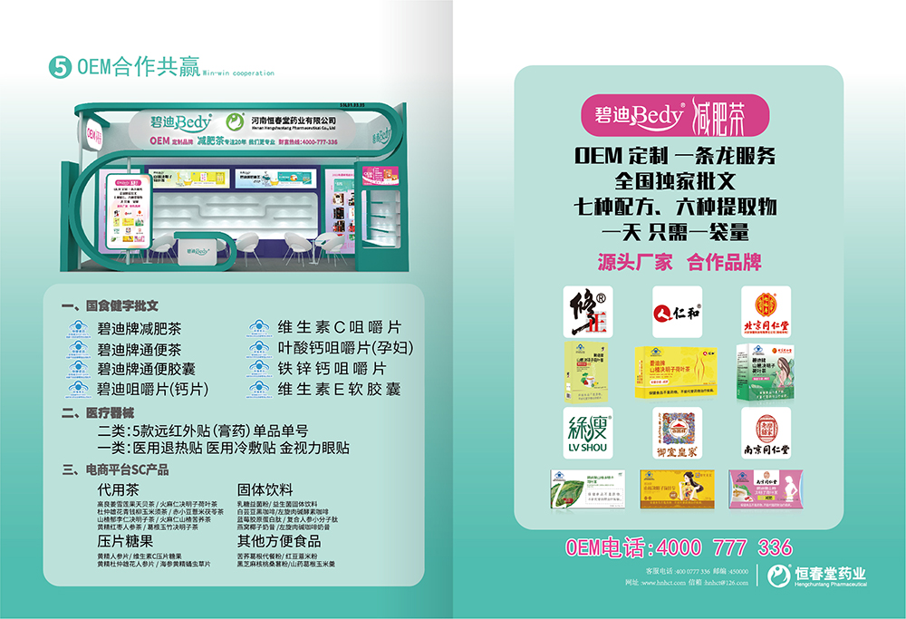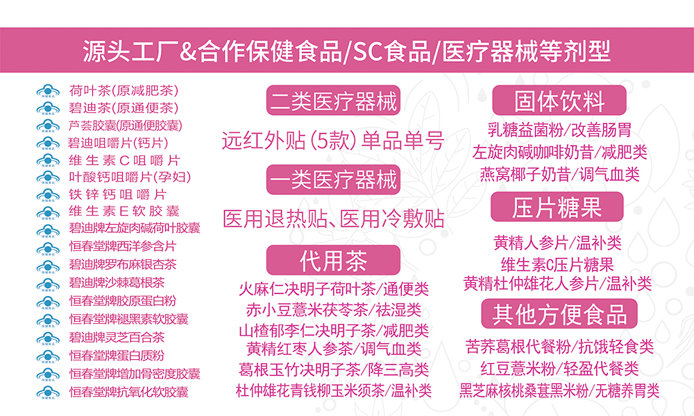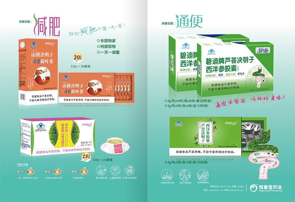 公司現(xiàn)擁有國食健字系列產(chǎn)品:碧迪牌秀爾茶(原減肥茶)、碧迪牌碧迪茶(原通便茶)、碧迪牌碧迪膠囊(原通便膠囊)、碧迪牌蘆薈決明子西洋參膠囊、碧迪牌碧迪咀嚼片、碧迪牌維生素C咀嚼片、蓋萊健牌葉酸鈣咀嚼片(孕婦)、蓋萊健牌鐵鋅鈣咀嚼片,近期還將獲得羅布麻銀杏茶、沙棘葛根茶、靈芝百合茶、恒春堂牌抗氧化軟膠囊、恒春堂牌褪黑素軟膠囊、恒春堂牌增加骨密度膠囊、恒春堂牌蛋白質(zhì)粉、恒春堂牌西洋參含片、左旋肉堿決明子荷葉膠囊、碧迪牌維生素E軟膠囊等產(chǎn)品。