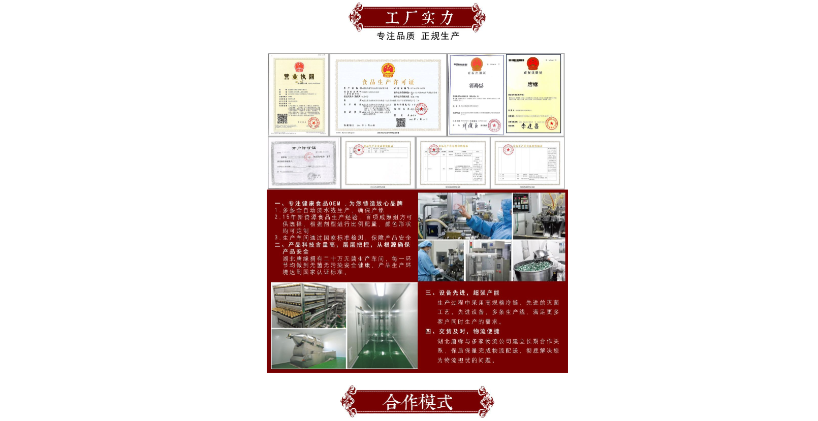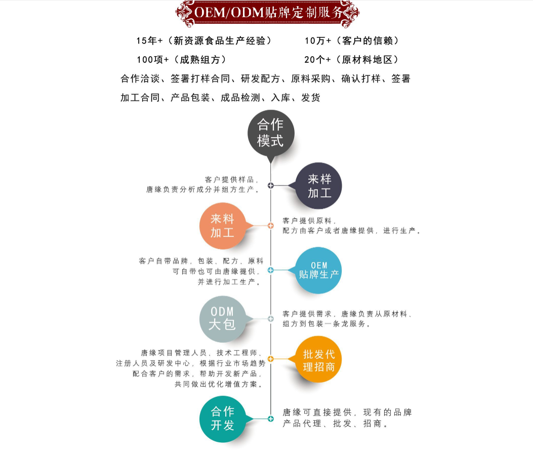 湖北唐緣生物醫(yī)藥科技有限公司坐落于“九省通衢” 的武漢。是一家集產(chǎn)品研發(fā)、生產(chǎn)、營銷、銷售為一體的 大健康全產(chǎn)業(yè)鏈綜合服務(wù)平臺。旗下?lián)碛泻碧凭壣镝t(yī) 藥科技有限公司、武漢二活堂生物工程有限公司、湖北浩 揚醫(yī)藥科技有限公司。 公司先后通過國家保健食品認(rèn)證、食品生產(chǎn)許可SC 認(rèn)證,擁有45000平米的高標(biāo)準(zhǔn)化潔凈廠房、30米的高規(guī) 格實驗室、多個大型原材料植基地和發(fā)酵基地、國內(nèi)外優(yōu) 質(zhì)原材料供應(yīng)商。產(chǎn)品體系涵蓋膏方/膏滋、飲料濃漿、 固體飲料、壓片糖果、袋泡茶、丸劑,六大劑型,現(xiàn)已有特 膳食品、新資源食品食品300余種。產(chǎn)品質(zhì)量、銷量、生 產(chǎn)規(guī)模、產(chǎn)能、產(chǎn)量居全國同類企業(yè)領(lǐng)先水平。作為中國 百家知名企業(yè)指定服務(wù)商,在業(yè)內(nèi)久負(fù)盛名,建立了良好口 碑和卓越商譽。