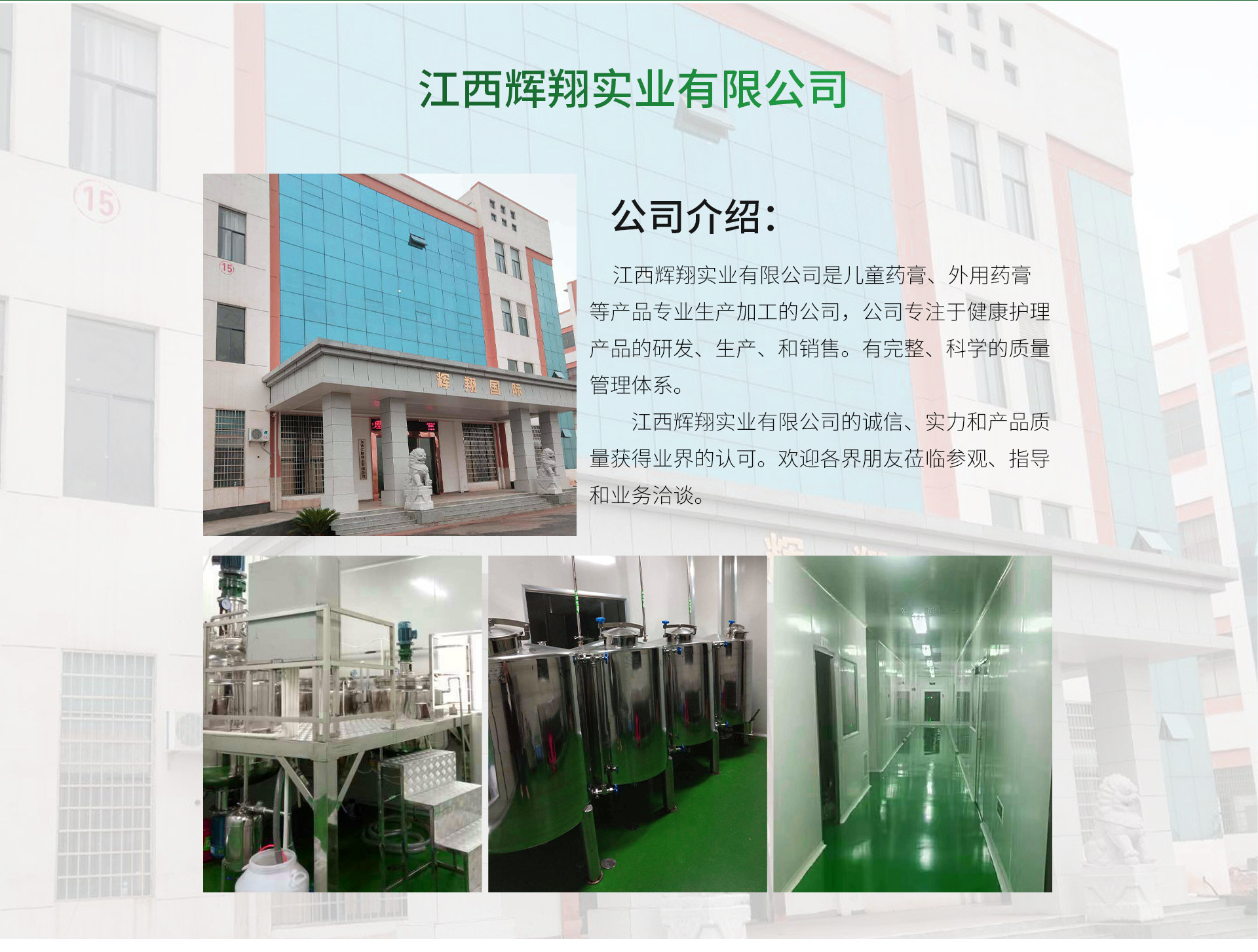 江西輝翔實業(yè)有限公司兒童藥膏、外用藥膏等產(chǎn)品專業(yè)生產(chǎn)加工的公司,擁有完整、科學(xué)的質(zhì)量管理體系。 江西輝翔實業(yè)有限公司的兒童藥膏、外用藥膏誠信、實力和產(chǎn)品質(zhì)量獲得業(yè)界的認(rèn)可。 歡迎各界朋友蒞臨參觀、指導(dǎo)和業(yè)務(wù)洽談。