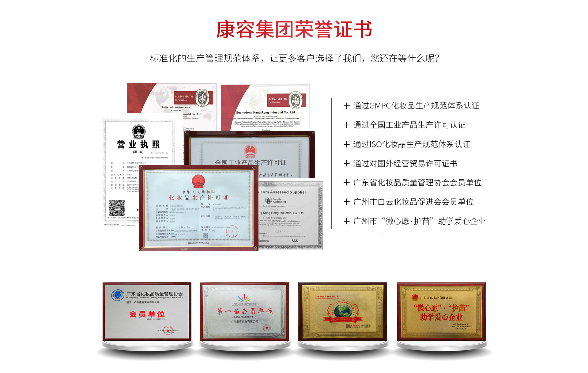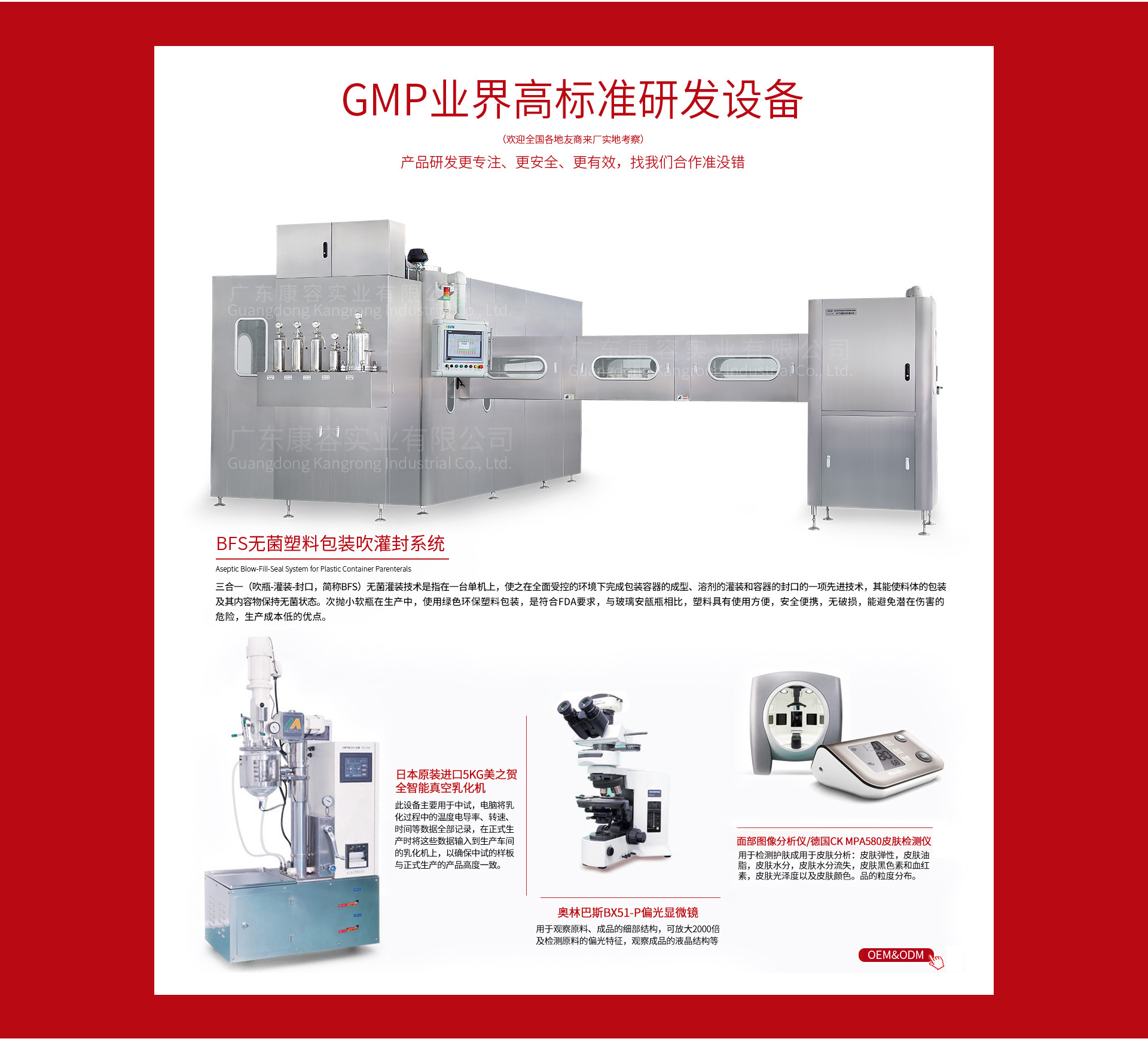 廣東康容集團公司依托廣州康蓉科技有限公司的厚重積淀,由領軍企業(yè)廣東康容實業(yè)有限公司發(fā)起成立的大型化妝品集團公司。公司位于廣州市白云區(qū)神山工業(yè)園鎮(zhèn)中北路。整個生產園區(qū)占地3萬多平方米,由辦公樓、廠房一、廠房二、成品大樓、宿舍樓、連廊等組成“梁派”建筑群,前有中心花園廣場,后有敞篷飄香大廳。廠區(qū)容積率低,綠化率高,名木相間,綠樹成蔭。假山、人造瀑布、國際標準網球場、石桌石凳石碑串聯(lián)點綴,構成了“廠在園中,園在廠中”的花園式生產園區(qū)。 一、經營內容 公司產業(yè)涵蓋了化妝品、次拋軟安瓶、生物凍干、消字號等高新科技產業(yè)園以及化妝品機械等范圍,形成了從產業(yè)布局、產品研發(fā)、生產銷售到產業(yè)服務的“多領域”、“ 一條龍”的業(yè)態(tài)鏈條。生產經營范圍以OEM\ODM為主,自有品牌為輔,即“賣生產”與“賣產品”相結合,實行“2+N”發(fā)展模式。