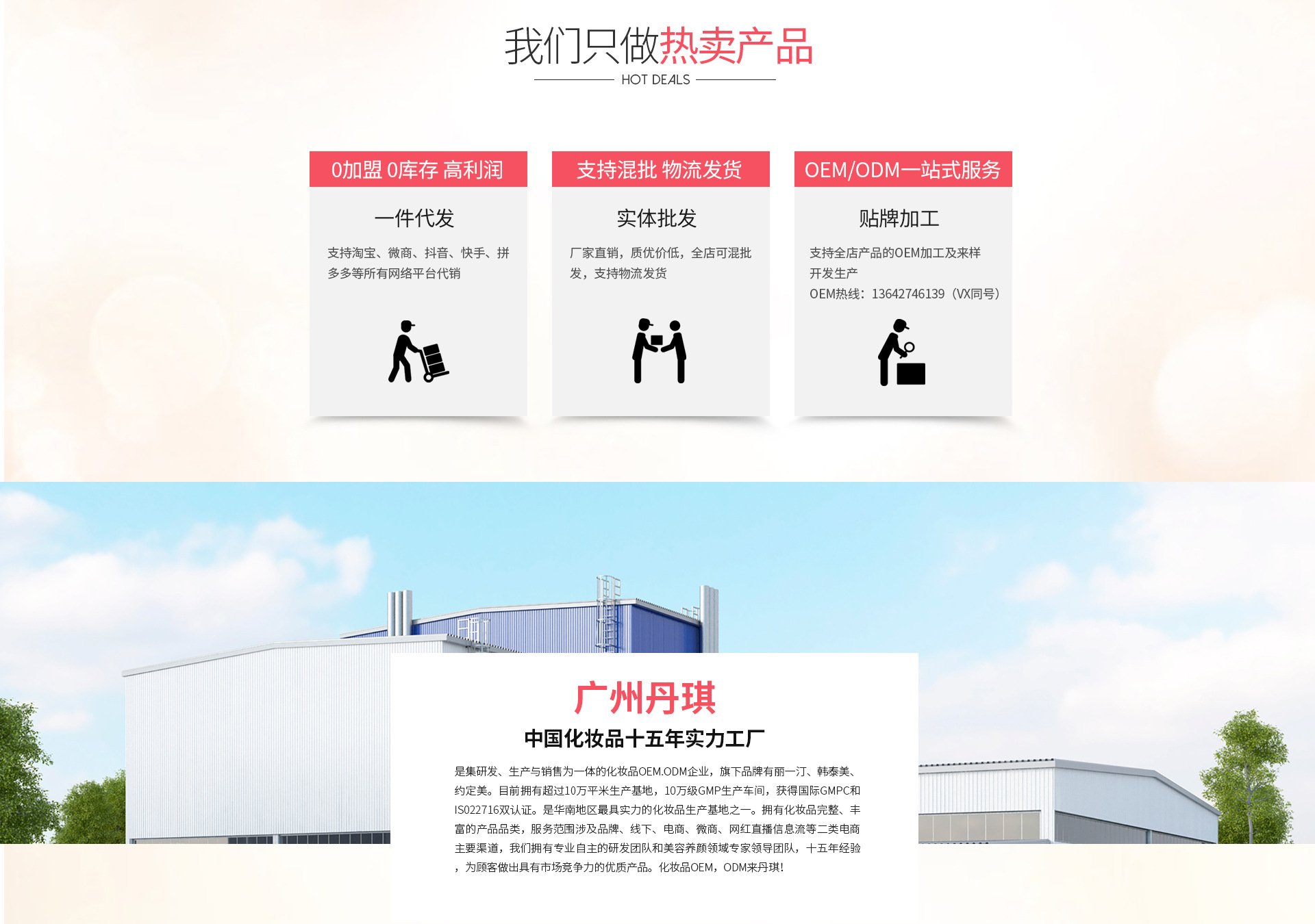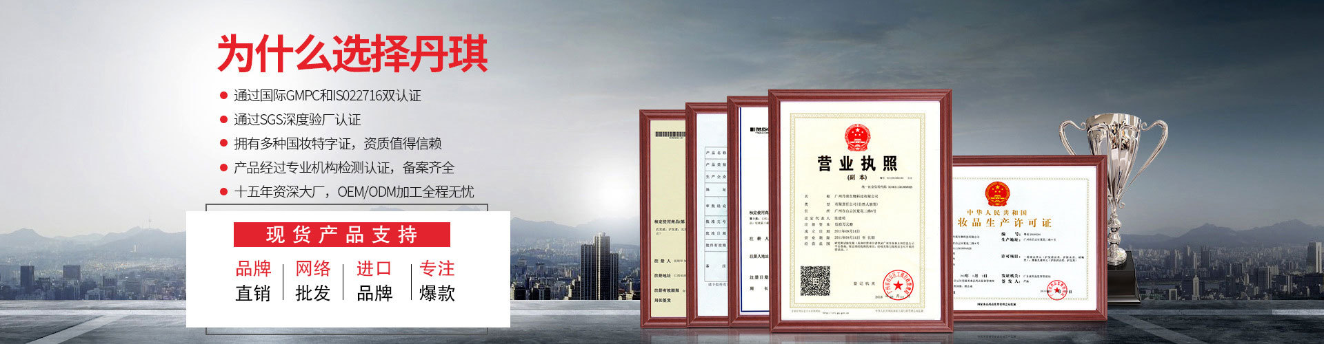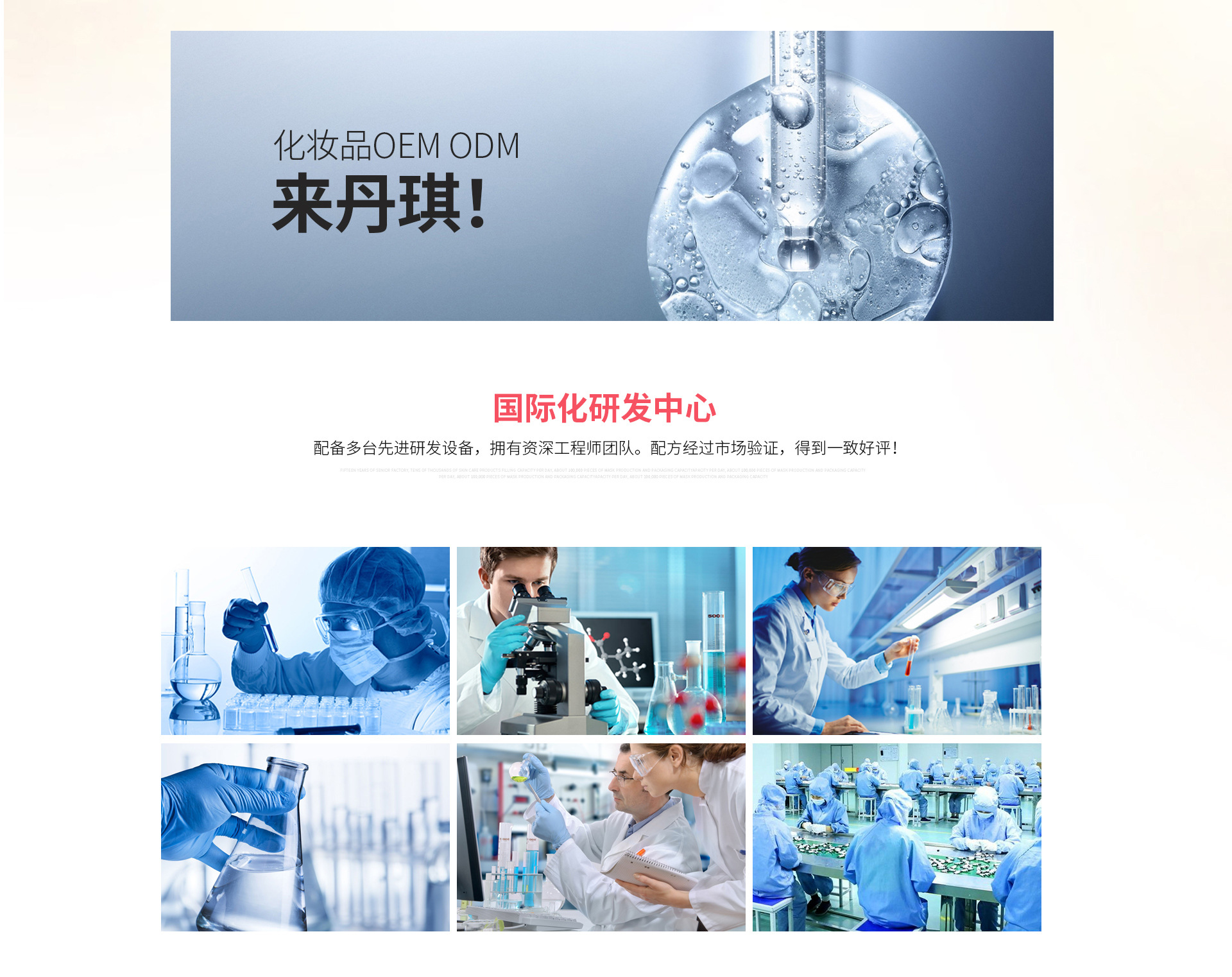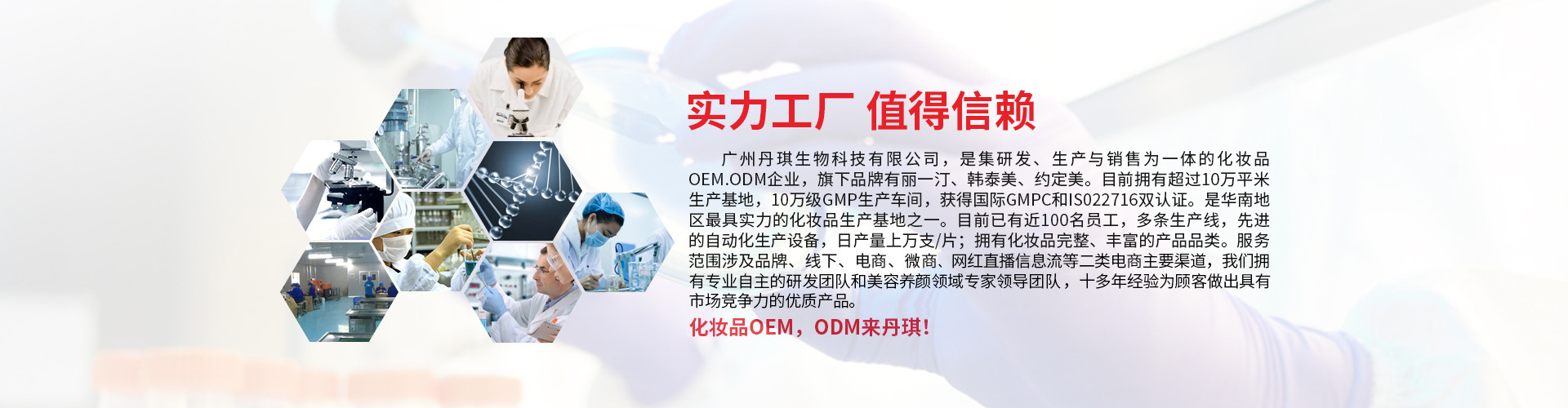 廣州丹琪生物科技有限公司,是集研發(fā)、生產(chǎn)與銷售為一體的化妝品OEM.ODM企業(yè),旗下品牌有麗一汀、韓泰美、約定美。目前擁有超過10萬平米生產(chǎn)基地,10萬級GMP生產(chǎn)車間,獲得國際GMPC和IS022716雙認(rèn)證。是華南地區(qū)最具實力的化妝品生產(chǎn)基地之一,是接受政府及公眾監(jiān)督的三證齊全、質(zhì)量保證實力加工廠。目前已有近100名員工,多條生產(chǎn)線,先進(jìn)的自動化生產(chǎn)設(shè)備,日產(chǎn)量上萬支/片;擁有化妝品完整、豐富的產(chǎn)品品類。服務(wù)范圍涉及品牌、線下、電商、微商等主流渠道,我們擁有專業(yè)自主的研發(fā)團(tuán)隊和美容養(yǎng)顏領(lǐng)域?qū)<翌I(lǐng)導(dǎo)團(tuán)隊,十多年經(jīng)驗,為顧客做出具有市場競爭力的優(yōu)質(zhì)產(chǎn)品??蛻舯椴紘鴥?nèi)外,受到客戶的一致認(rèn)可?;瘖y品OEM,ODM來丹琪!歡迎社會各界、新老客戶蒞臨工廠指導(dǎo)、交流、洽談業(yè)務(wù)合作。