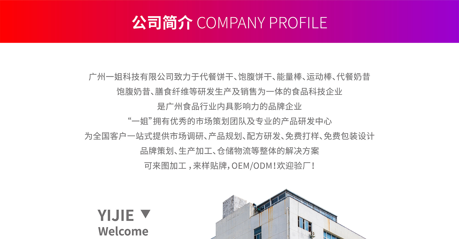 廣州一姐科技有限公司是代餐餅干,代餐棒,運動棒,能量棒,代餐奶昔,代餐飲品,代餐食品,美體美院,男性健康食品,女性私護,等產(chǎn)品專業(yè)生產(chǎn)加工的,工廠擁有非常強大的他團隊,研發(fā)團隊,銷售團隊,生產(chǎn)團隊,技術(shù)團隊,擁有完整、科學的質(zhì)量管理體系。廣州一姐科技有限公司的誠信、實力和產(chǎn)品質(zhì)量獲得業(yè)界的認可。歡迎各界朋友蒞臨參觀、指導和業(yè)務(wù)洽談。