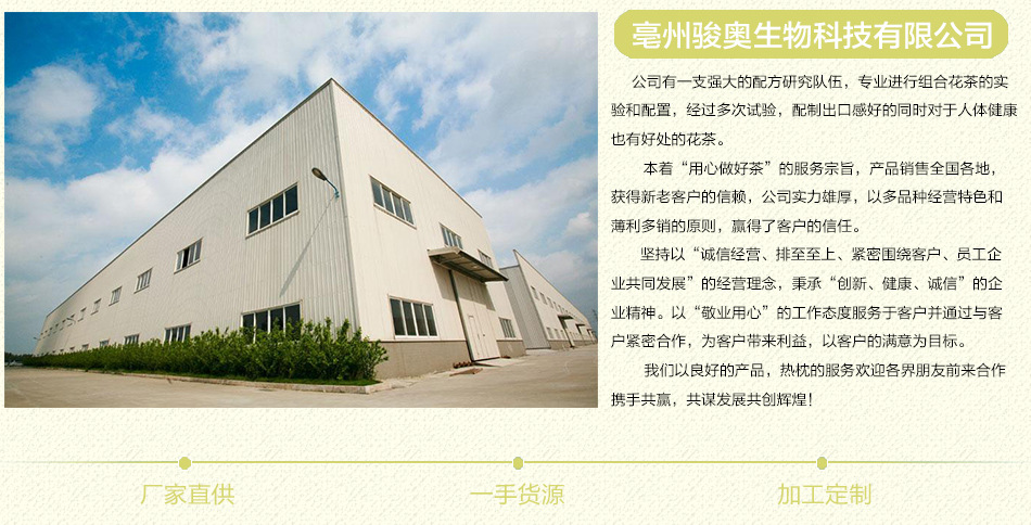 亳州市駿奧生物科技有限公司是花茶、代用茶、農(nóng)產(chǎn)品等產(chǎn)品專業(yè)生產(chǎn)加工的公司,擁有完整、科學(xué)的質(zhì)量管理體系。亳州市駿奧生物科技有限公司的誠(chéng)信、實(shí)力和產(chǎn)品質(zhì)量獲得業(yè)界的認(rèn)可。歡迎各界朋友蒞臨參觀、指導(dǎo)和業(yè)務(wù)洽談。