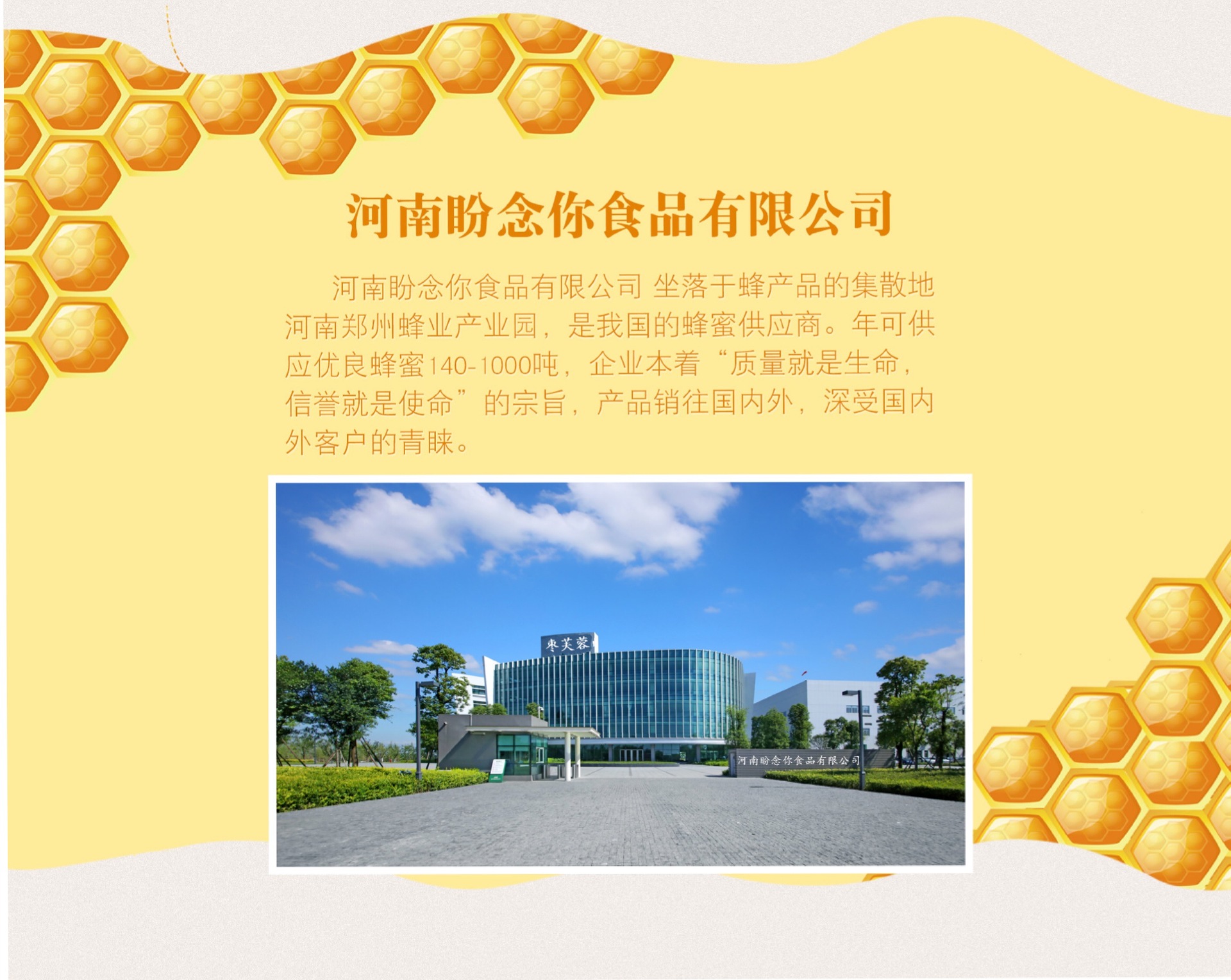 河南盼念你食品有限公司坐落于蜂產(chǎn)品的集散地,河南鄭州航空港經(jīng)濟綜合實驗區(qū),是我國專業(yè)的蜂產(chǎn)品供應(yīng)商。年可供應(yīng)優(yōu)質(zhì)蜂蜜140~1000噸,蜂王漿10~50噸。企業(yè)本著“質(zhì)量就是生命,信譽就是使命”的宗旨,產(chǎn)品銷往國內(nèi)外,深受國內(nèi)外客戶的青睞