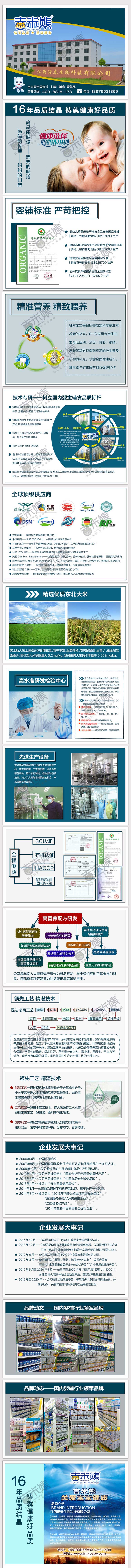 【吉米熊】的研發(fā)和生產(chǎn)中心科研力量雄厚,擁有資深育嬰專家組、營(yíng)養(yǎng)師、配方師,同時(shí)還與眾多研究機(jī)構(gòu)和母嬰營(yíng)養(yǎng)護(hù)理機(jī)構(gòu)合作,秉承 “務(wù)實(shí)、專業(yè)、專注”的精神,堅(jiān)持為寶寶提供“健康、天然、科學(xué)、營(yíng)養(yǎng)”的經(jīng)營(yíng)理念,遵循品質(zhì)至上、崇尚自然的標(biāo)準(zhǔn)原則,恪守“以寶寶健康哺育、開心成長(zhǎng)發(fā)育”的服務(wù)宗旨,不斷引進(jìn)國(guó)內(nèi)外先進(jìn)的新技術(shù)和新設(shè)備,做出最適合、最營(yíng)養(yǎng)、最健康的每一盒“吉米熊”產(chǎn)品,讓寶寶享受媽媽般的愛與呵護(hù)!