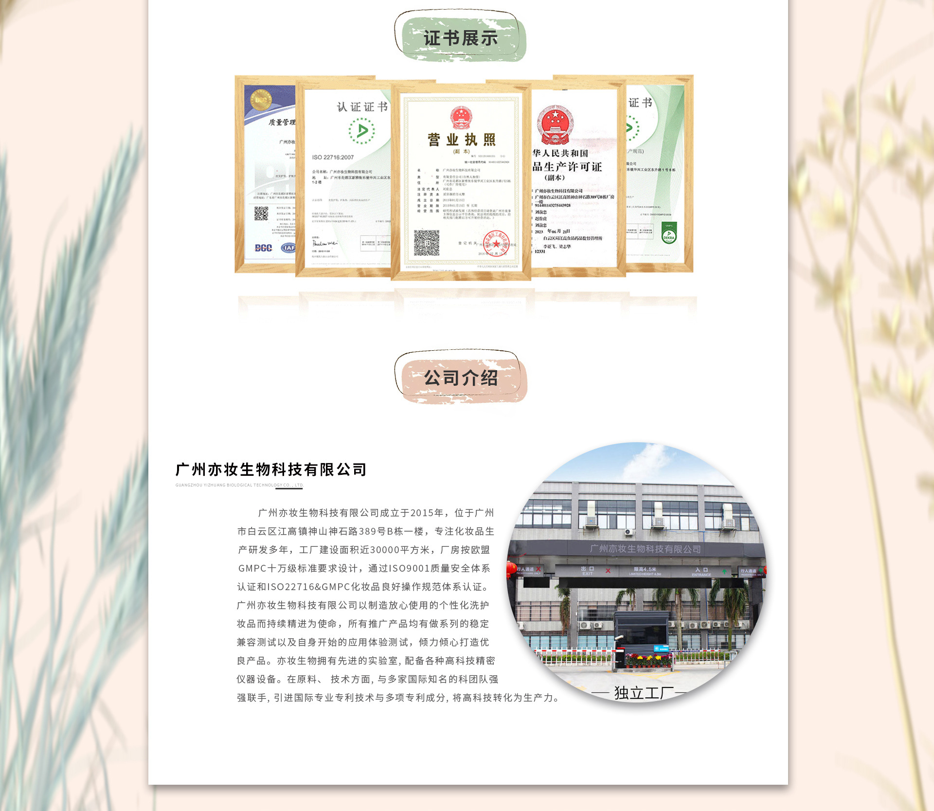 廣州亦妝生物科技有限公司成立于2015年,公司地址位于廣州市白云區(qū)江高鎮(zhèn)神山神石路389號(hào)B棟一樓,專注化妝品生產(chǎn)研發(fā)16年,工廠建設(shè)面積近30000平方米,廠房按歐盟GMPC十萬(wàn)級(jí)標(biāo)準(zhǔn)要求設(shè)計(jì),通過(guò)ISO9001質(zhì)量安全體系認(rèn)證和ISO22716&GMPC化妝品良好操作規(guī)范體系認(rèn)證。廣州亦妝生物科技有限公司以制造放心使用的個(gè)性化洗護(hù)化妝品而持續(xù)精進(jìn)為使命,所有推廣產(chǎn)品均有做系列的穩(wěn)定兼容測(cè)試以及自身開(kāi)始的應(yīng)用體驗(yàn)測(cè)試,傾力傾心打造優(yōu)質(zhì)產(chǎn)品。 亦妝生物擁有先進(jìn)的實(shí)驗(yàn)室, 配備各種高科技精密儀器設(shè)備。在原料、 技術(shù)方面, 與多家國(guó)際知名的科研團(tuán)隊(duì)強(qiáng)強(qiáng)聯(lián)手, 引進(jìn)國(guó)際頂尖專利技術(shù)與多項(xiàng)專利成分, 致力于將高科技轉(zhuǎn)化為生產(chǎn)力。