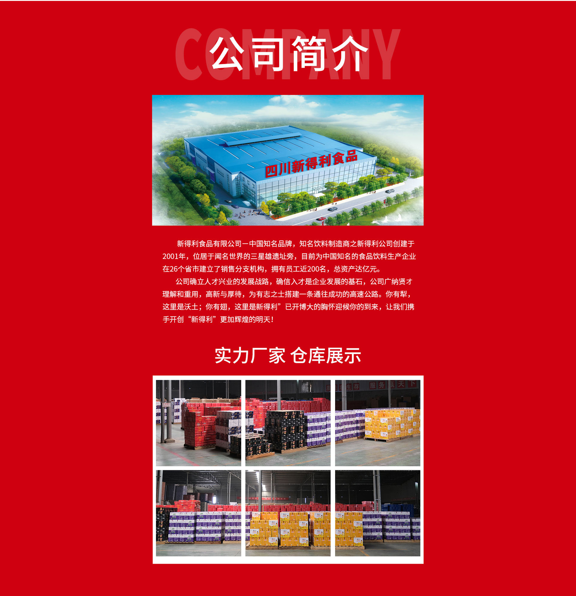 新得利食品有限公司一中國知名品牌,知名飲料制造商之新得利公司創(chuàng)建于2001年,位居于聞名世界的三星堆遺址旁,目前為中國知名的食品飲料生產(chǎn)企業(yè)。在26個(gè)省市建立了銷售分支機(jī)構(gòu),擁有員工近200名,總資產(chǎn)達(dá)億元。 公司確立人才興業(yè)的發(fā)展戰(zhàn)路,確信人才是企業(yè)發(fā)展的基石,公司廣納賢才,理解和重用,高薪與厚待,為有志之士搭建一條通往成功的高速公路。你有犁,這里是沃土;你有翅,這里是新得利”已開博大的胸懷迎候你的到來,讓我們攜手開創(chuàng)“新得利”更加輝煌的明天!