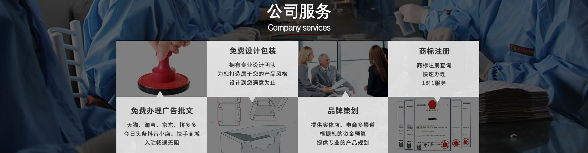 主要產(chǎn)品有:膏藥、黑膏藥、膏藥貼、三伏貼、咳喘貼、眼貼等各種貼劑公司涉及業(yè)務(wù):產(chǎn)品策劃、公司注冊、商標(biāo)注冊、包裝設(shè)計(jì)、運(yùn)營策劃、網(wǎng)絡(luò)推廣等;專注一類、二類醫(yī)療器械,保健用品等外用貼劑,抑菌消毒用品的生產(chǎn)、銷售的一站式服務(wù)。