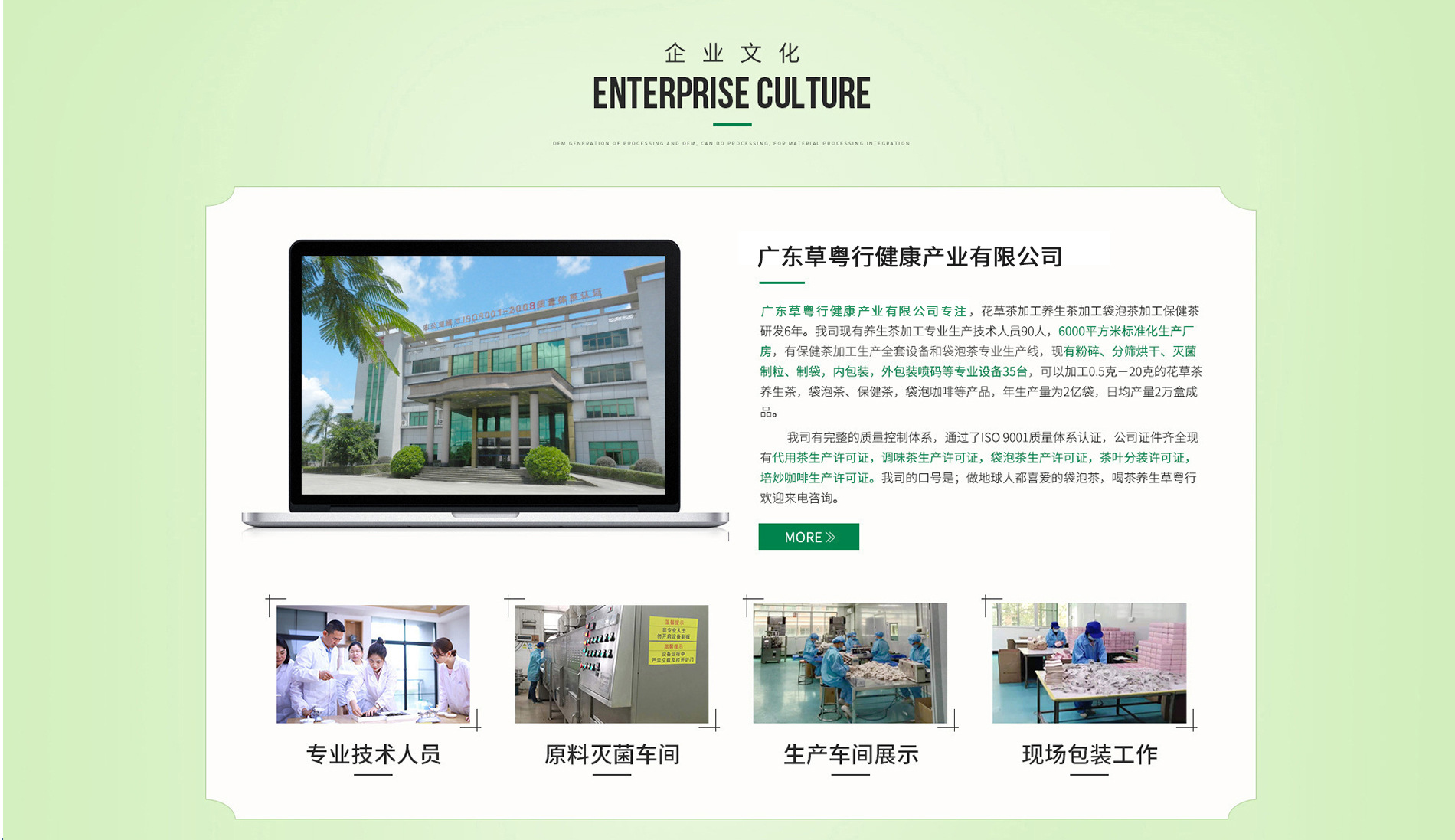 廣東草粵行健康產(chǎn)業(yè)有限公司(簡(jiǎn)稱草粵行)經(jīng)過(guò)多年的專注經(jīng)營(yíng)發(fā)展已成為一家集茶制品產(chǎn)品研發(fā)、包裝設(shè)計(jì)、生產(chǎn)、銷售于一體的創(chuàng)新型國(guó)家高新技術(shù)企業(yè)。通過(guò)多年不斷鉆研創(chuàng)新改進(jìn)已取得多項(xiàng)茶制品相關(guān)實(shí)用新型專利,精制藥食同源袋泡茶和精制茶全工藝加工技術(shù)服務(wù)兩項(xiàng)產(chǎn)品也被認(rèn)定為廣東省高新技術(shù)產(chǎn)品。擁有8000余平方米的SC認(rèn)證標(biāo)準(zhǔn)化生產(chǎn)車間及設(shè)施齊全的檢驗(yàn)室,通過(guò)HACCP質(zhì)量體系認(rèn)證制訂了一套完整、科學(xué)的質(zhì)量管理體系來(lái)確保產(chǎn)品質(zhì)量,具備茶葉分裝、袋泡茶、代用茶、調(diào)味茶(代用茶、袋泡茶、調(diào)味茶同時(shí)具備出口生產(chǎn)資質(zhì))和沖調(diào)類方便食品兩大類別生產(chǎn)許可,擁有一支100人左右具備多年茶制品及方便食品專業(yè)研發(fā)生產(chǎn)經(jīng)驗(yàn)的技術(shù)團(tuán)隊(duì),配備有2條茶制品及1條方便食品全工藝生產(chǎn)線,可以滿足客戶需要一體化訂制生產(chǎn)各種茶葉、袋泡茶、配方茶、水果茶、調(diào)味茶、方便食品,也可以來(lái)料加工、貼牌生產(chǎn)。