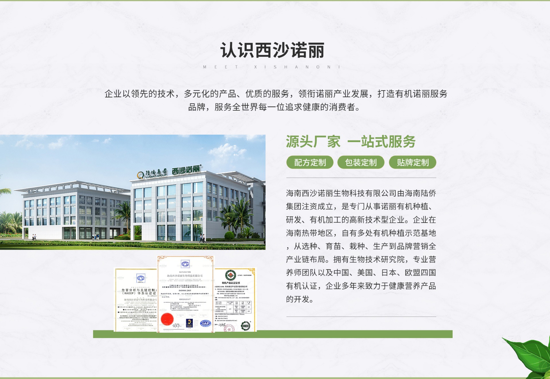 海南西沙諾麗生物有限公司由海南陸僑集團(tuán)注資成立,是專門從事諾麗有機(jī)種植、研發(fā)、有機(jī)加工的高新技術(shù)型企業(yè)。企業(yè)在海南熱帶地區(qū),自有多處有機(jī)種植示范基地,從選種、育苗、栽種、生產(chǎn)到品牌營銷全產(chǎn)業(yè)鏈布局。擁有生物技術(shù)研究院、專業(yè)營養(yǎng)師團(tuán)隊(duì)以及中國、美國、日本、歐盟四國有機(jī)認(rèn)證,企業(yè)多年來致力于健康營養(yǎng)產(chǎn)品的開發(fā)。海南西沙諾麗生物科技有限公司的誠信、實(shí)力和產(chǎn)品質(zhì)量獲得業(yè)界的認(rèn)可。歡迎各界朋友蒞臨參觀、指導(dǎo)和業(yè)務(wù)洽談。