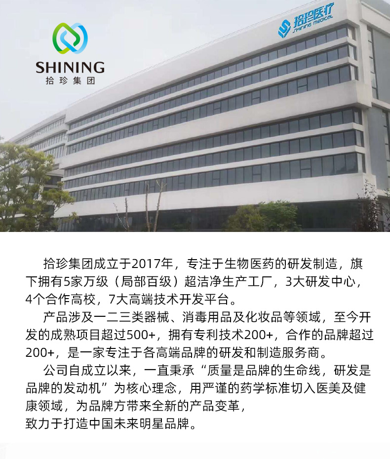 拾珍集團(tuán)成立于2017年,專注于生物醫(yī)藥的研發(fā)制造,旗下?lián)碛?家萬(wàn)級(jí)(局部百級(jí))超潔凈生產(chǎn)工廠,3大研發(fā)中心,4個(gè)合作高校,7大高端技術(shù)開發(fā)平臺(tái)。