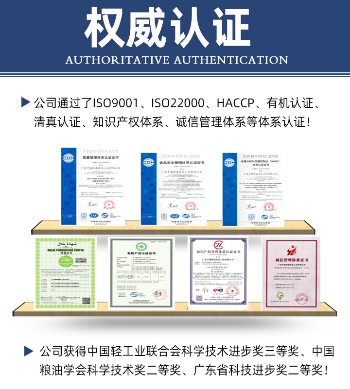 公司先后通過(guò)了HACCP食品安全管理體系認(rèn)證、ISO 9001質(zhì)量管理體系認(rèn)證、ISO 22000食品安全管理體系認(rèn)證、誠(chéng)信體系認(rèn)證,并且獲得有機(jī)產(chǎn)品認(rèn)證、清真食品認(rèn)證證書(shū)等。公司獲得的榮譽(yù)情況如下: