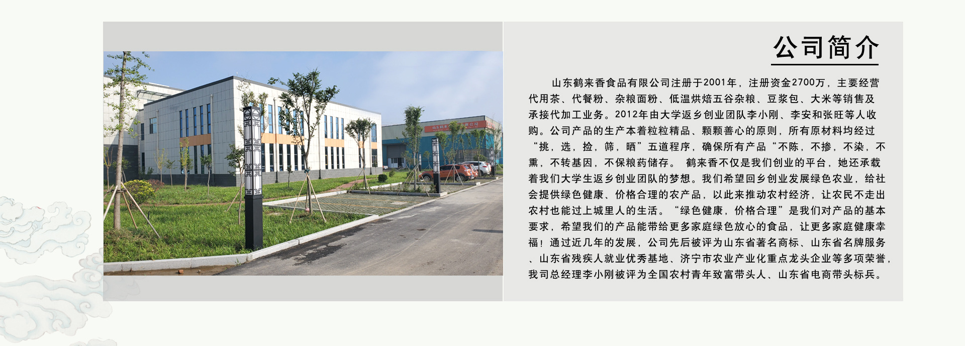 山東鶴來香食品有限公司成立于2001年,主營代用茶、代餐粉、豆?jié){包原料、雜糧面粉、低溫烘焙五谷雜糧,公司以:“發(fā)展綠色農(nóng)業(yè),給社會提供綠色健康價格合理的農(nóng)產(chǎn)品;推動農(nóng)村經(jīng)濟,讓農(nóng)民不走出農(nóng)村也能過上城里人的生活”作為企業(yè)新的發(fā)展理念。目前企業(yè)年銷售額3000余萬,提供就業(yè)崗位60余人,其中返鄉(xiāng)大學(xué)生12人,兼職在校博士生導(dǎo)師3人,兼職在校碩士8人,當?shù)貧埣踩?人,社會矯正人員2人。 通過近些年的發(fā)展,山東鶴來香食品有限公司被評為:“山東名牌”“山東省著名商標”“省級文明單位”“山東省文明誠信民營企業(yè)”“山東省殘疾人就業(yè)創(chuàng)業(yè)優(yōu)秀基地”“山東省新型職業(yè)農(nóng)民鄉(xiāng)村振興示范站”“農(nóng)業(yè)產(chǎn)業(yè)化市級龍頭企業(yè)”“濟寧市先進民營企業(yè)”等榮譽。李小剛被評為“全國農(nóng)村青年致富帶頭人”“山東省農(nóng)村電商標兵”“市級勞動模范”“濟寧市五四優(yōu)秀青年”“非公有制優(yōu)秀建設(shè)者”“濟寧市優(yōu)秀共產(chǎn)黨員”等榮譽。省廣播電視臺,省新聞
