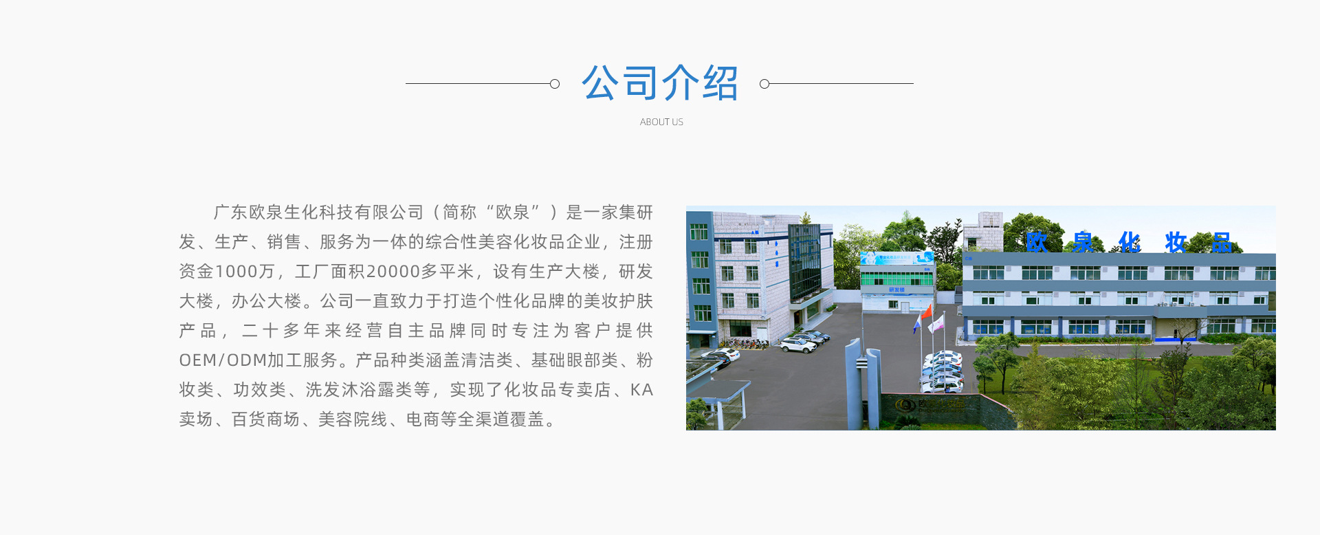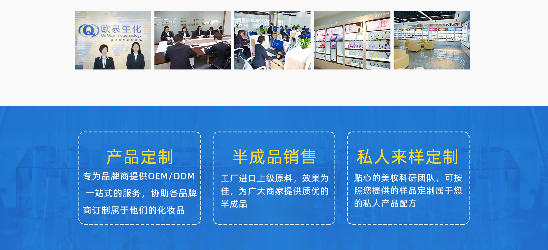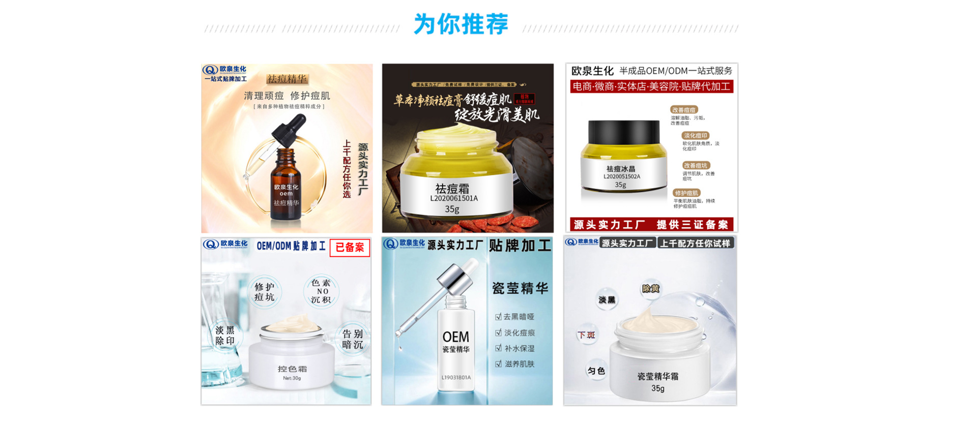 廣東歐泉生化科技有限公司(簡稱“歐泉”)是一家集化妝品研發(fā)、生產、服務為一體的綜合性美容化妝品企業(yè),注冊資金1000萬,工廠建筑面積13000多平方米,專注化妝品ODM/OEM十余年。產品種類涵蓋面膜系列,保濕系列,祛斑祛痘系列,修護系列,原液系列,抗皺緊膚系列,BB/CC霜系列,卸妝潔面等系列產品。產品暢銷美容院線、連鎖店、專賣店、微電商、網紅、社交電商等全渠道覆蓋。