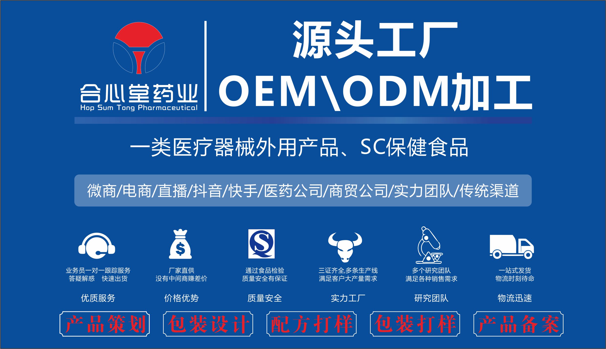 通化市合心堂藥業(yè)集團有限公司是一家專業(yè)的一類醫(yī)療器械外用產(chǎn)品、SC保健食品研發(fā)、生產(chǎn)、加工的企業(yè),承接OEM/ODM代加工業(yè)務(wù),產(chǎn)品策劃、包裝設(shè)計、配方打樣、包裝打樣、產(chǎn)品備案等均可,源頭工廠,廠家直供,沒有中間商賺差價,通過食品檢驗質(zhì)量安全有保證,三證齊全,多條生產(chǎn)線,滿足客戶大產(chǎn)量需求,多個研究團隊,滿足各種銷售需求。