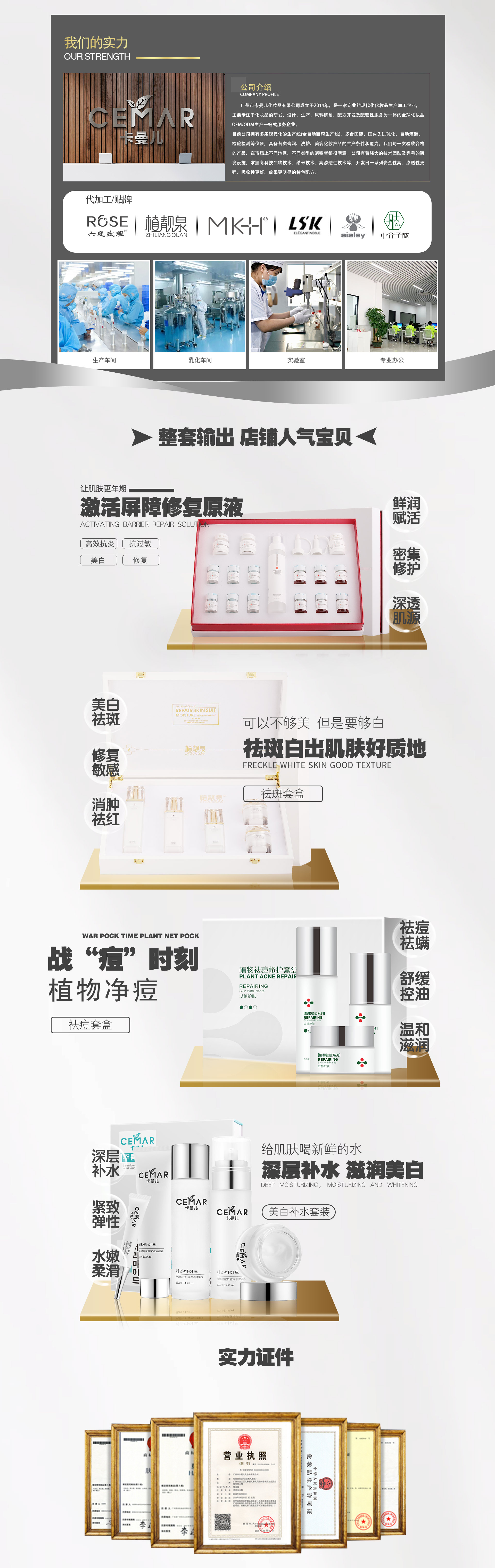廣州市卡曼兒化妝品有限公司成立于2014年,是一家專業(yè)的現(xiàn)代化化妝品生產(chǎn)加工企業(yè),主要專注于化妝品的研發(fā)、設(shè)計、生產(chǎn)、原料研制、配方開發(fā)及配套性服務(wù)為一體的全球化妝品OEM/ODM生產(chǎn)一站式服務(wù)企業(yè)。 目前公司擁有多條現(xiàn)代化的生產(chǎn)線(全自動面膜生產(chǎn)線),多臺國際、國內(nèi)先進乳化、自動灌裝、檢驗檢測等儀器,具備各類膏霜、洗護、美容化妝產(chǎn)品的生產(chǎn)條件和能力。我們每一支驗收合格的產(chǎn)品,在市場上不同地區(qū),不同類型的消費者都很滿意。公司有著強大的技術(shù)團隊及完善的研發(fā)設(shè)施,掌握高科技生物技術(shù)、納米技術(shù)、高滲透性技術(shù)等,開發(fā)出一系列安全性高、滲透性更強、吸收性更好、效果更明顯的特色配方。 卡曼兒研發(fā)的豐富的產(chǎn)品種類,服務(wù)品牌高達900多家,產(chǎn)品涉及專業(yè)線、徽商、網(wǎng)紅直播、電子商務(wù)、電視購物等主流銷售渠道,銷售市場回饋極好,客戶回單率高。專注在基礎(chǔ)、功效護膚類、消字號私密類、械字號修護類、洗護類產(chǎn)品的研發(fā)。