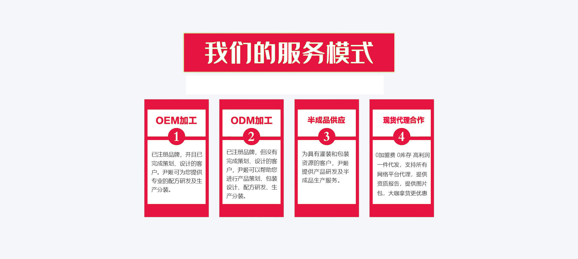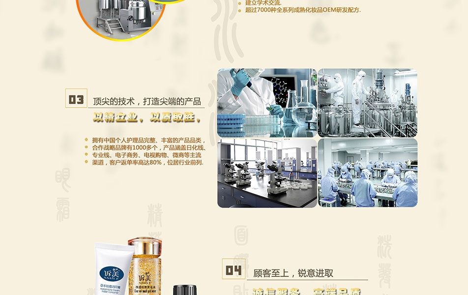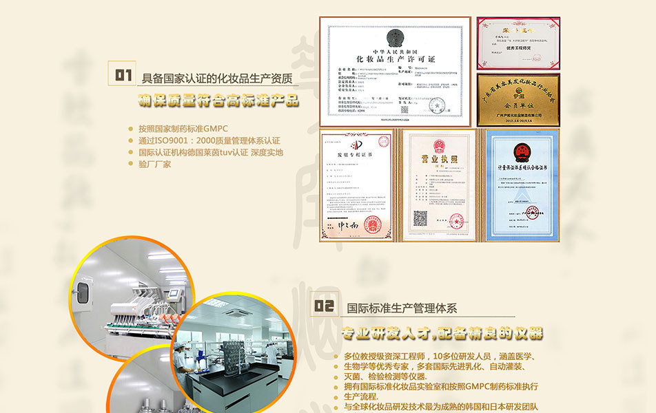 廣州市尹姬化妝品制有限公司是一家集研發(fā)、生產(chǎn)為一體的專業(yè)化妝品企業(yè),提供批發(fā)、零售、代理和代加工貼牌OEM/ODM服務(wù),我們所的產(chǎn)品有供眼霜,手霜,精油,精華液,原液,精華素,面膜,面膜貼、面貼膜,眼膜,眼膜貼,眼貼膜,面霜,臉霜,洗手液,洗發(fā)水,沐浴露,祛斑產(chǎn)品,豐胸產(chǎn)品,減肥產(chǎn)品,脫毛產(chǎn)品,衣物柔順劑,洗衣液,廚房清潔劑,潔廁劑,地板清潔劑等。 公司廠區(qū)環(huán)境優(yōu)美,生產(chǎn)車間環(huán)境完全按照GMPC認證所需要的條件建設(shè),并通過“IS09001-2008” 質(zhì)量認證和“GMPC”認證。目前擁有多條現(xiàn)代化的生產(chǎn)線,多臺/套國際、國內(nèi)先進乳化、自動灌裝、滅菌、檢驗檢測等儀器,具備各類膏霜、洗護、美容化妝產(chǎn)品的生產(chǎn)條件和能力,年生產(chǎn)能力可達到數(shù)千萬支,同時工廠不僅能生產(chǎn)各種形態(tài)、規(guī)格、品種的化妝品,還能實現(xiàn)化妝品常規(guī)檢驗項目的檢測,全方位保證企業(yè)的產(chǎn)品在消費者手中的安全使用,讓消費者放心消費。