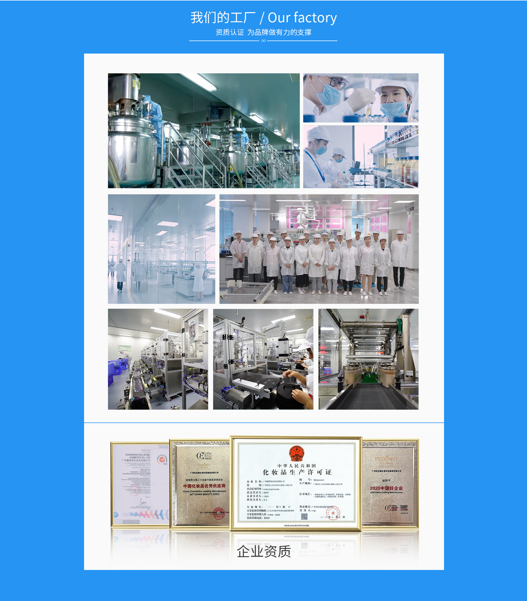 廣州黛萊美化妝品有限公司成立于2004年,是一家集化妝品原料研制、配方開發(fā)和加工生產(chǎn)及配套性服務(wù)于一體的專業(yè)OEM代加工企業(yè),坐落于廣州市。公司研發(fā)中心1700平米,研發(fā)人員42名;工廠建筑面積3.5萬平米,制造車間面積1萬平米,產(chǎn)能覆蓋日化生產(chǎn)制造領(lǐng)域。具備各類膏霜,洗護(hù),彩妝,美容產(chǎn)品生產(chǎn)能力。