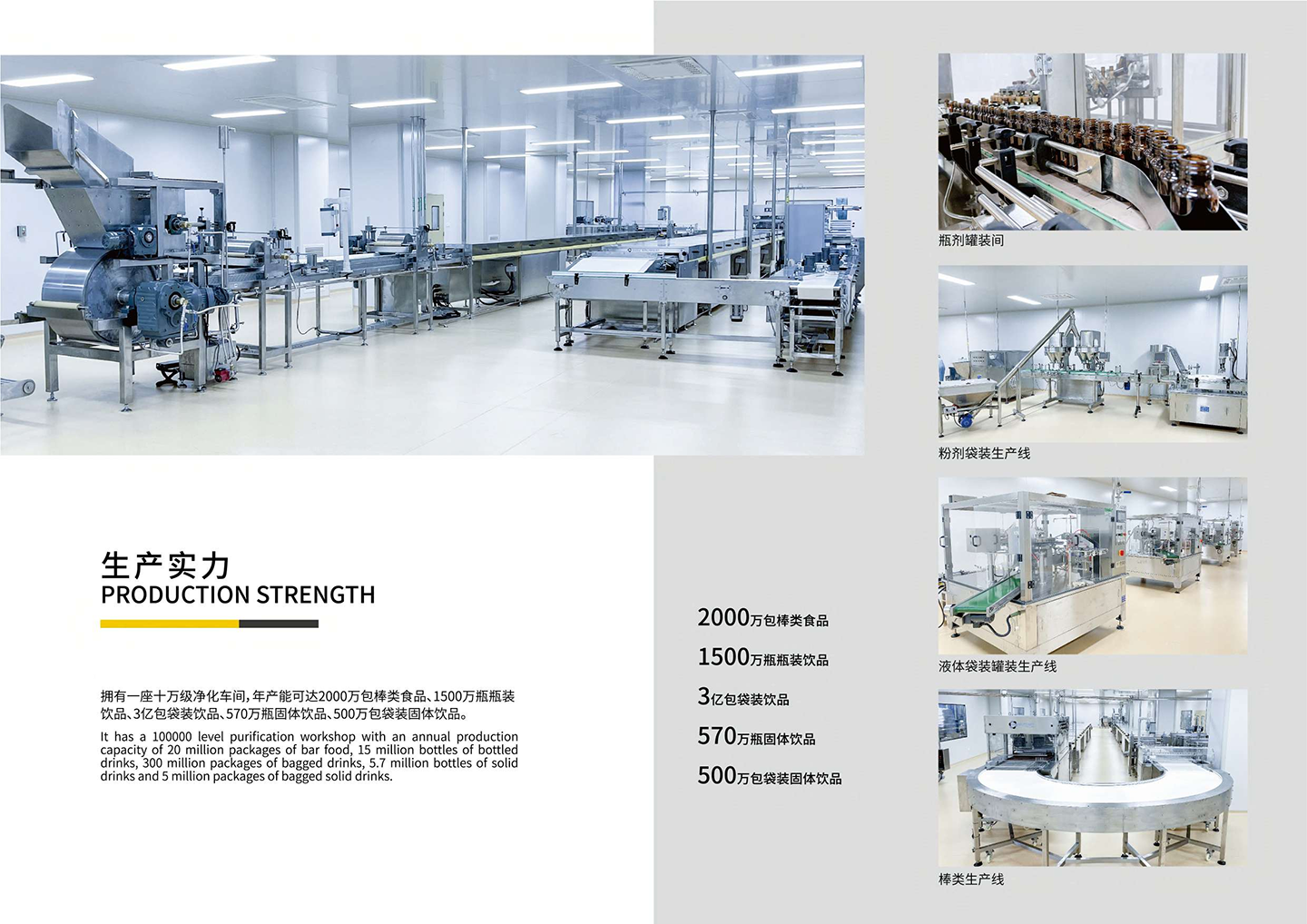 擁有一座十萬級凈化車間,年產(chǎn)能可達(dá)2000萬包棒類食品、1500萬瓶瓶裝飲品、3億包袋裝飲品、570萬瓶固體飲品、500萬包袋裝固體飲品。