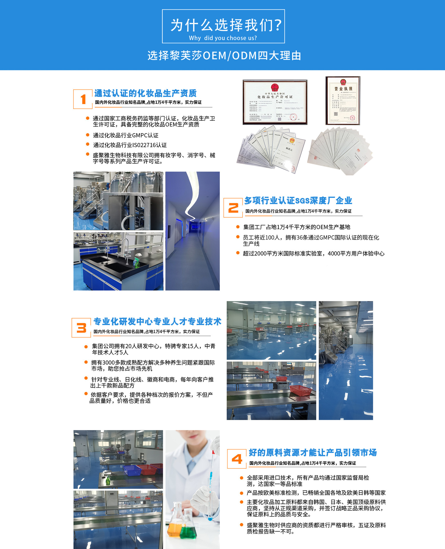 廣州黎芙莎化妝品有限公司是一家集研發(fā)、生產(chǎn)、批發(fā)、加工為一體的美容護(hù)膚公司。公司自有工廠,獨立的產(chǎn)品研發(fā)團(tuán)隊,現(xiàn)代化的生產(chǎn)機械設(shè)備,擁有完整科學(xué)的質(zhì)量管理體系。生產(chǎn)基地面積10000多平方米,廠房建設(shè)嚴(yán)格按照國家藥檢質(zhì)量檢測標(biāo)準(zhǔn)執(zhí)行,生產(chǎn)及衛(wèi)生許可均達(dá)國家化妝品廠生產(chǎn)經(jīng)營標(biāo)準(zhǔn)。 公司核心熱銷產(chǎn)品主要為面膜、潔面乳、精華液、保濕霜、BB霜、防曬霜、防曬乳、美白面膜、身體乳、潔面乳、水乳霜膏、泥膜、護(hù)手霜、爽膚水、化妝水、護(hù)膚品套裝等產(chǎn)品和加工原料。公司旗下品牌有:黎芙莎、雪彌、媚顏堂、吉舒。 廣州黎芙莎化妝品有限公司一直秉持“誠信為本,客戶至上”的宗旨,本著“品質(zhì)為本,精益求精”的經(jīng)營銷售理念,獲得了業(yè)界客戶的認(rèn)可和贊譽,也使公司得到持續(xù)的發(fā)展。期待與各位業(yè)界新老客戶攜手共進(jìn),共贏輝煌未來!