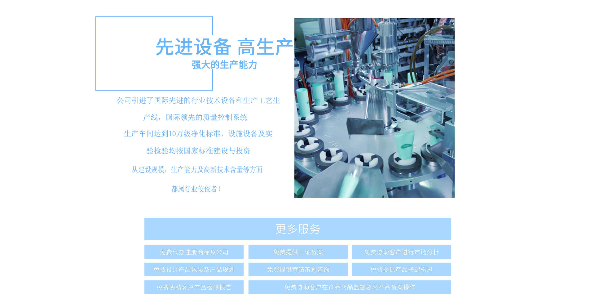 廣州市黛美雅化妝品有限公司是一家集科研、生產(chǎn)、銷售為一體的超大型化妝品OEM/ODM加工企業(yè),擁有完整、科學(xué)的質(zhì)量管理體系,是一家極富創(chuàng)新精神的化妝品廠家。成立于2018年,公司“以人為本,以精立業(yè),以質(zhì)取勝,以誠(chéng)服務(wù)”的經(jīng)營(yíng)理念,以產(chǎn)品質(zhì)量為企業(yè)發(fā)展之命脈,以市場(chǎng)為消費(fèi)導(dǎo)向,以信譽(yù)為企業(yè)生存之根本。擁有獨(dú)立化妝品生產(chǎn)廠房2000多平方米,擁有獨(dú)立的生產(chǎn)車間,采用十萬(wàn)級(jí)空氣凈化標(biāo)準(zhǔn)