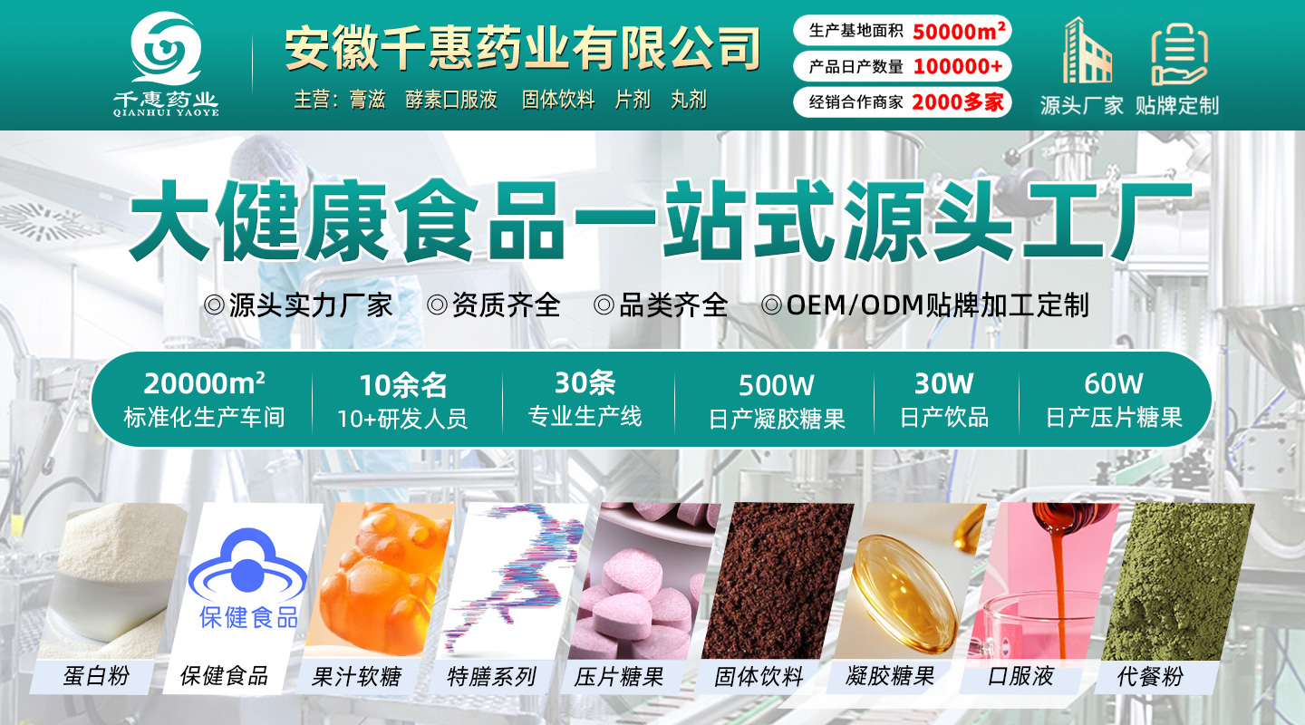 安徽千惠藥業(yè)有限公司是一家集研發(fā)、生產(chǎn)、銷售及物流于一體的現(xiàn)代化健康產(chǎn)業(yè)企業(yè)。公司注冊(cè)資本1000萬(wàn)元人民幣,投資總額達(dá)5000萬(wàn)元,占地面積35.5畝,建筑面積超3萬(wàn)平方米,擁有十萬(wàn)級(jí)潔凈車間和專業(yè)檢驗(yàn)實(shí)驗(yàn)室,年生產(chǎn)能力超6000萬(wàn)元。核心業(yè)務(wù)與產(chǎn)品,公司專注于大健康產(chǎn)業(yè)10年、特殊膳食、營(yíng)養(yǎng)補(bǔ)充劑等領(lǐng)域的研發(fā)與生產(chǎn),產(chǎn)品涵蓋片劑、固體飲料、壓片糖果、軟膠囊、硬膠囊等多劑型。提供OEM貼牌生產(chǎn),合作品牌包括南京同仁堂、國(guó)藥藥材,國(guó)藥健康等。